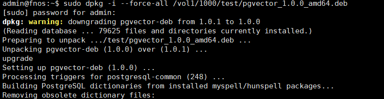(下面是示例,不要直接复制)sudo dpkg -i --force-all /vol1/1000/test/pgvector_1.0.1_amd64.deb