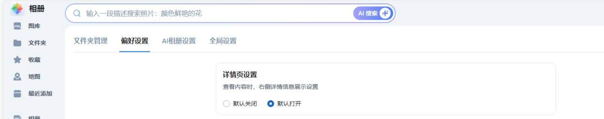 在相册设置中,新增详情页设置,可默认打开详情页,这样打开图像时可以一眼看到信息关于存储位置、标签等内容,提供不同用户的看图需求