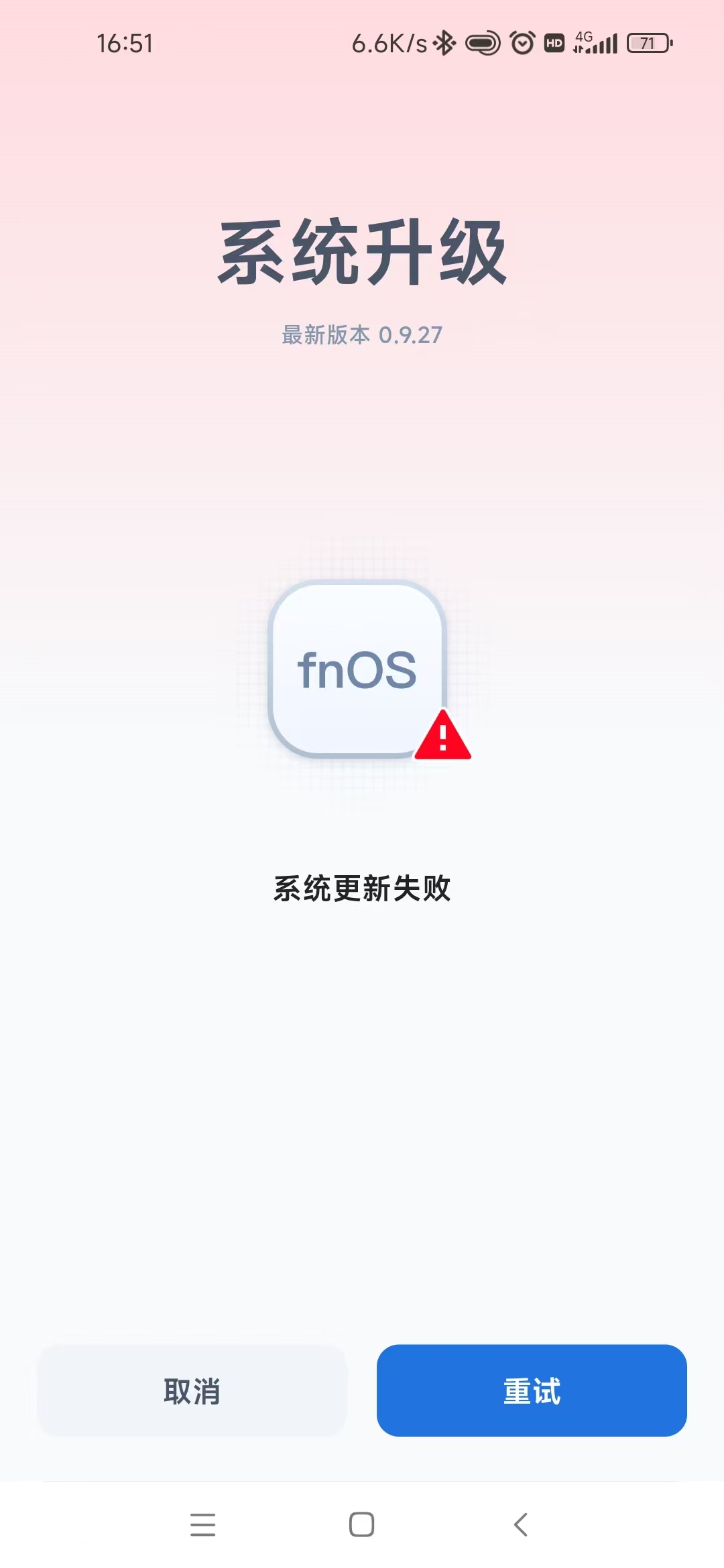 更新0.9.26到0.9.27,提示下载1M补丁,然后更新时提示升级失败已是最新版,退出APP再进来还是0.9.26,并且升级到0.9.27的提示没有了。