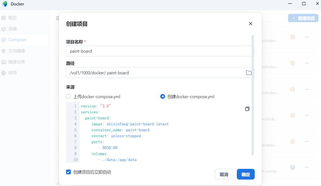 2️⃣ 桌面打开Docker,点击侧栏 Compose -> 新增项目 -> 输入项目名称 -> 设置路径选择前面第1️⃣步创建的文件夹->创建docker-compose.yml把下面代码复制进去,点击完成 直至构建完成