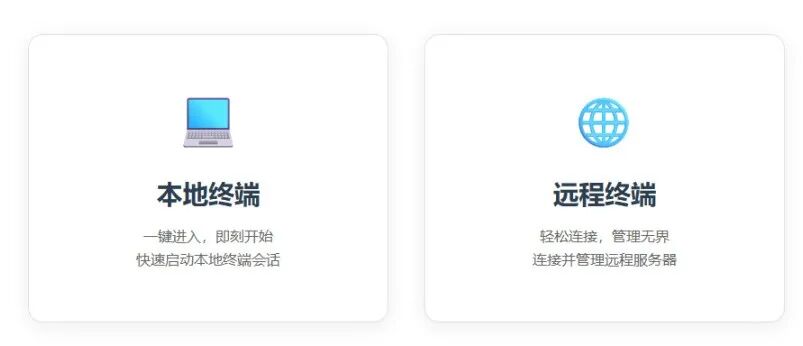 • 原生 Shell 环境: 完整命令行体验,支持本地与远程访问;