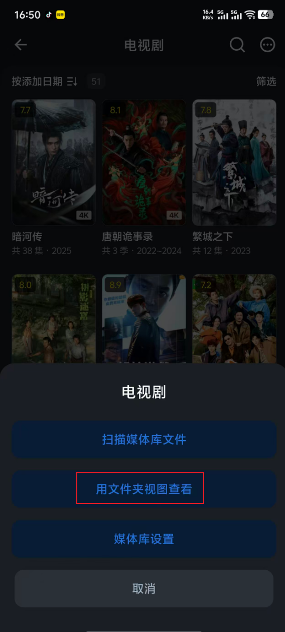 首先是网盘直链没办法实时监控网盘入库刷新,并且飞牛的刮削,走的是正规网盘api刮削,对于风控有严格的限制(来自网盘),每次刮削都需要对文件夹下全盘扫描(有文件夹视角,可以单独刮有变化的文件夹但是跟我刚才说的一样,每次都需要去手动,而且文件夹视角需要点更多次进入二级、三级菜单操作,见下图,更麻烦)
