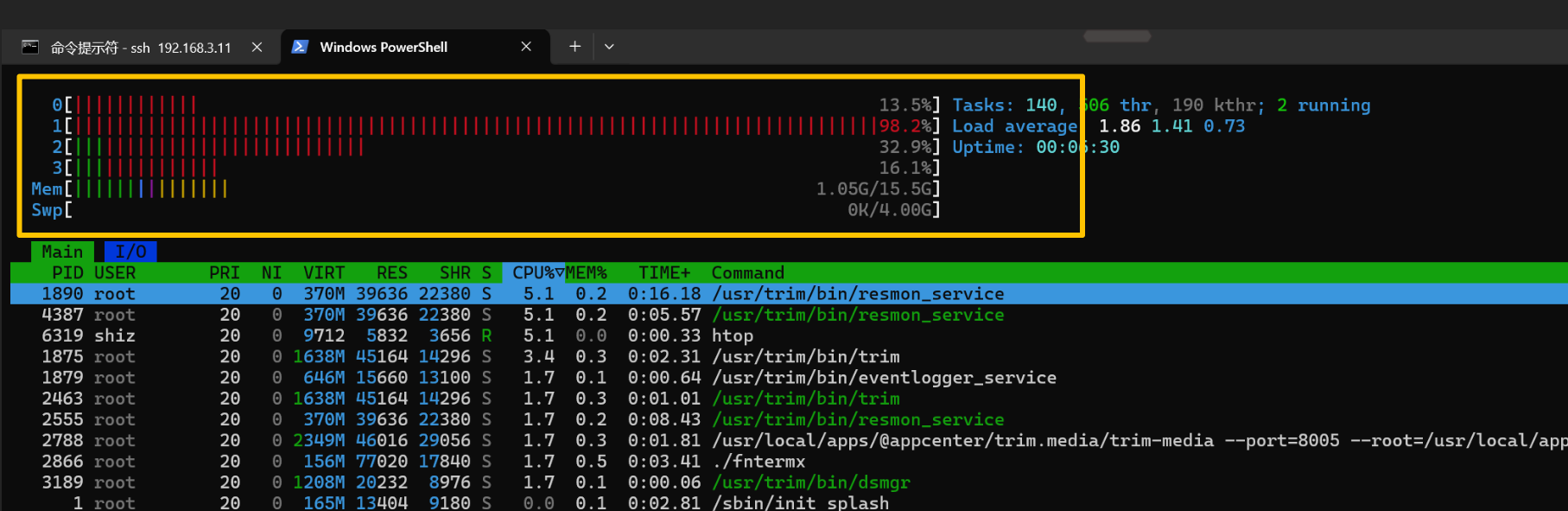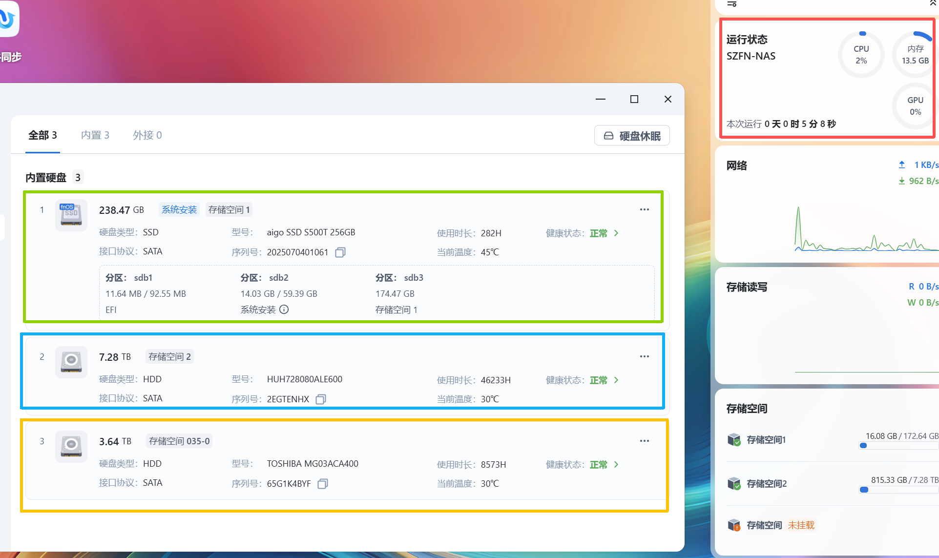 重启后,可以看到插入的3块硬盘都识别出来了。CPU占用也很稳定。