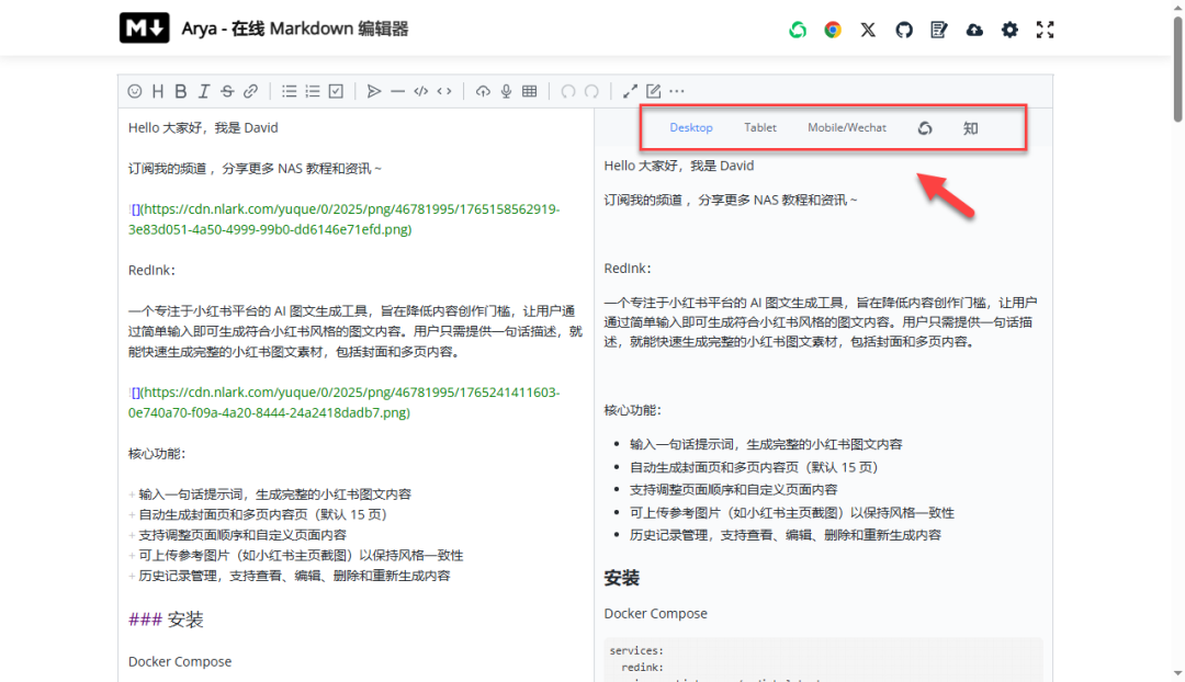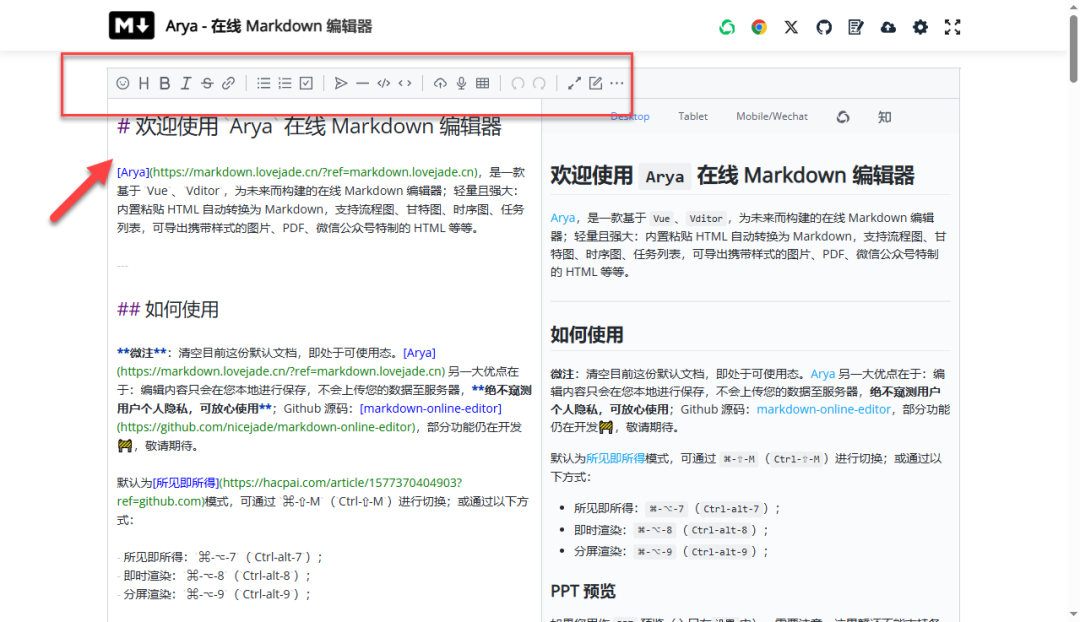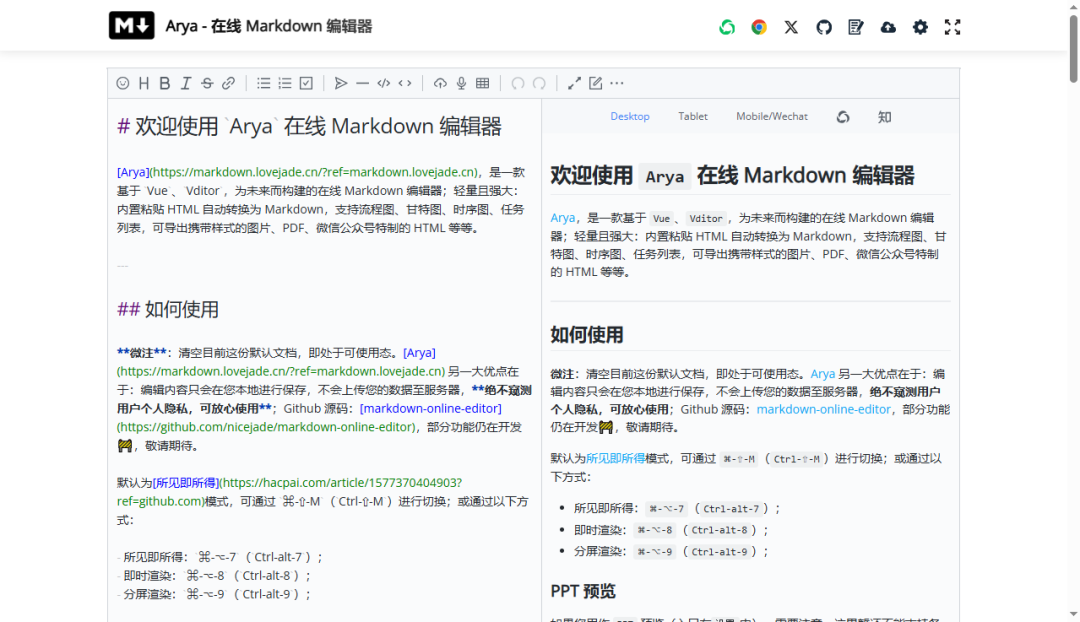 使用方式一般都是复制粘贴到左侧,或者选择 Markdown 格式文档导入