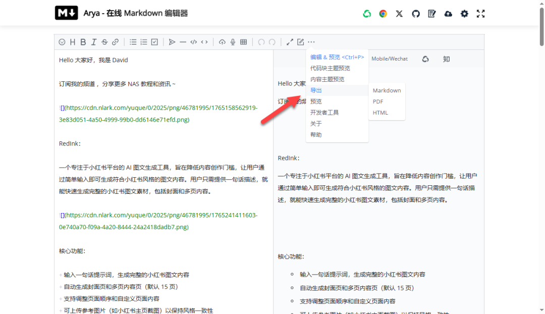 - • ✨ 支持导出携带样式的 PDF、PNG、JPEG 等;
