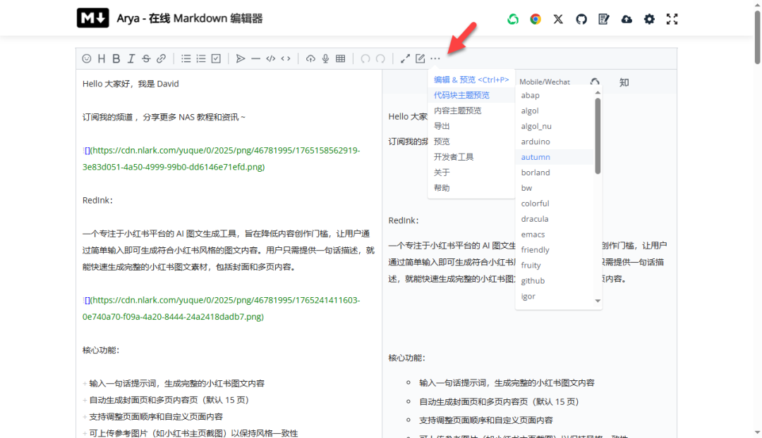 一款基于 Vue2、Vditor,所构建的在线 Markdown 编辑器,支持绘制流程图、甘特图、时序图、任务列表、echarts 图表、五线谱,以及 PPT 预览、视频音频解析、HTML 自动转换为 Markdown 等功能。