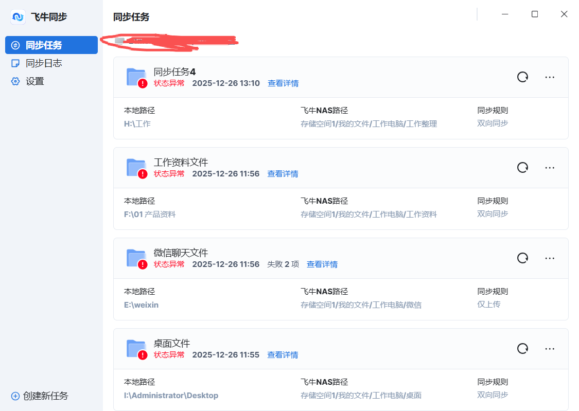 前两天工作电脑开的应用多,就把飞牛同步退了,中间未关过机,今天打算同步一下,打开飞牛同步,让升级,就升了级(当前版本:V0.1.5),结果一直显示状态异常,试了几次都不行,我以为是网络问题,但是我从网页端是可以访问NAS的,具体如图