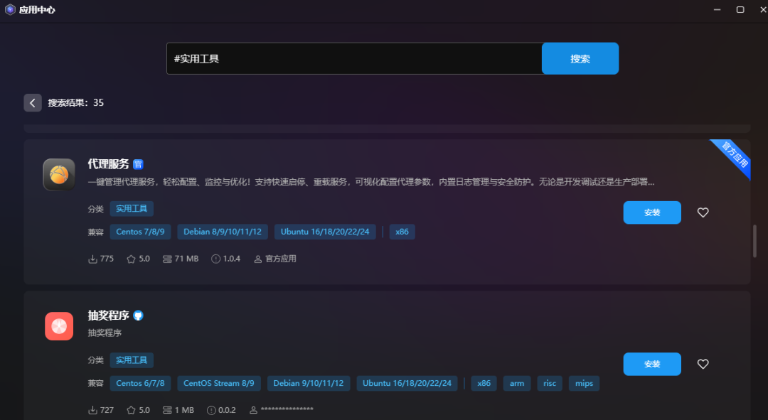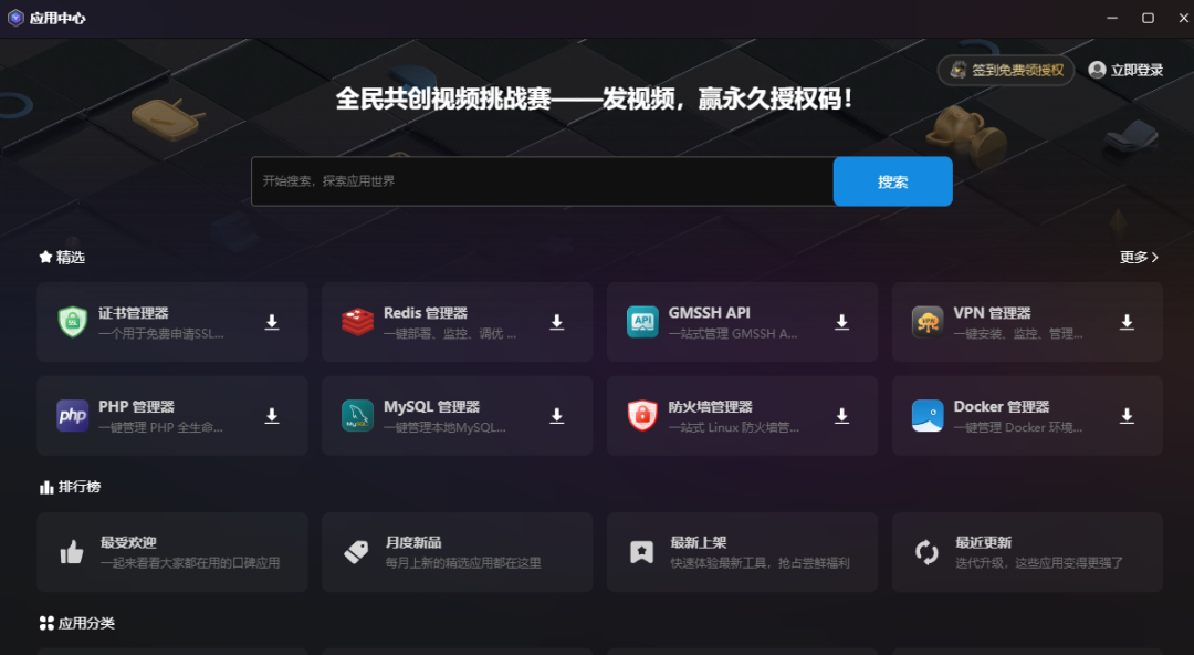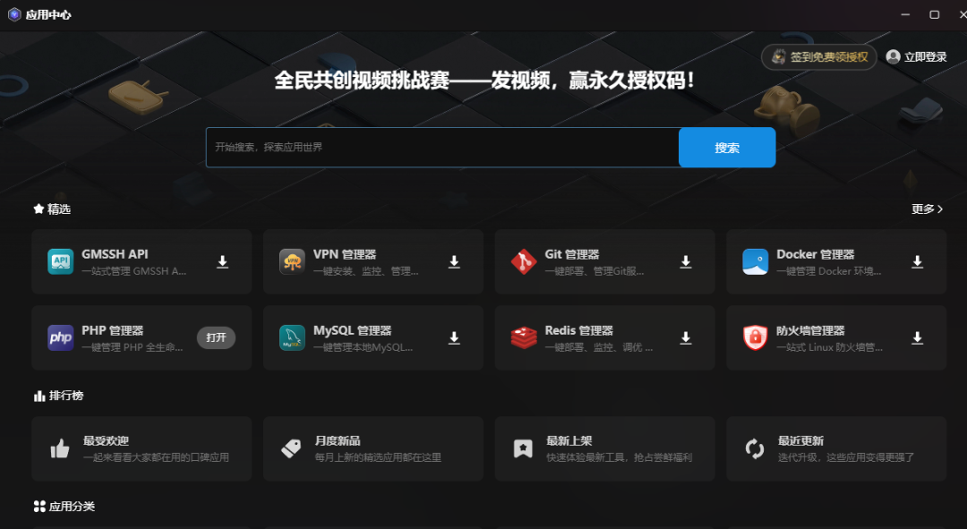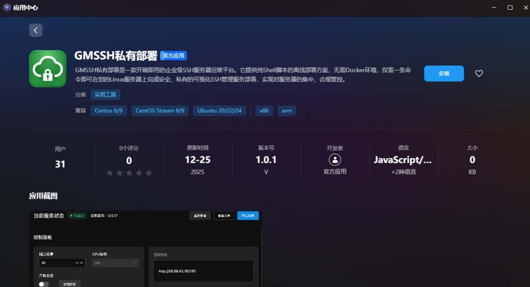 在功能上,GMSSH 内置了应用中心,一些常见服务已经做好了预配置,一键就能部署,省去了自己写脚本、查文档的时间。