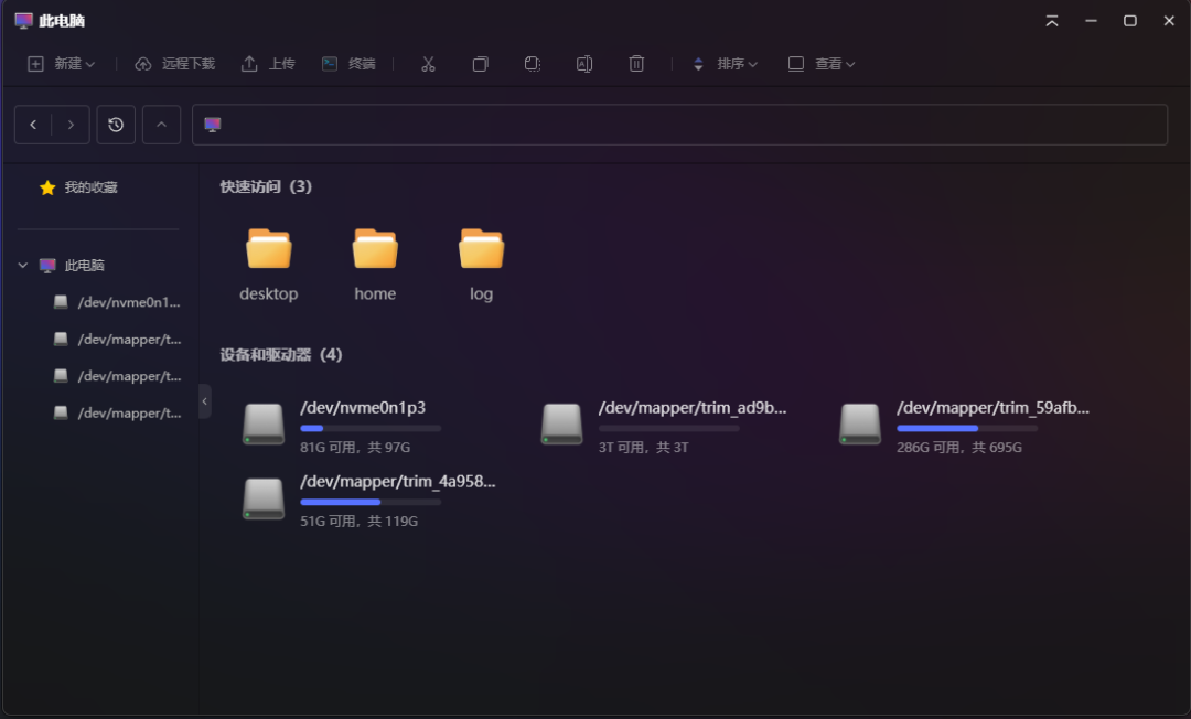 1️⃣ 此电脑(文件),和Windows一样,直接把所有硬盘展示出来,查看文件非常的方便,我现在都是直接在这个里面编辑一些代码,基本所有格式都是支持直接打开的