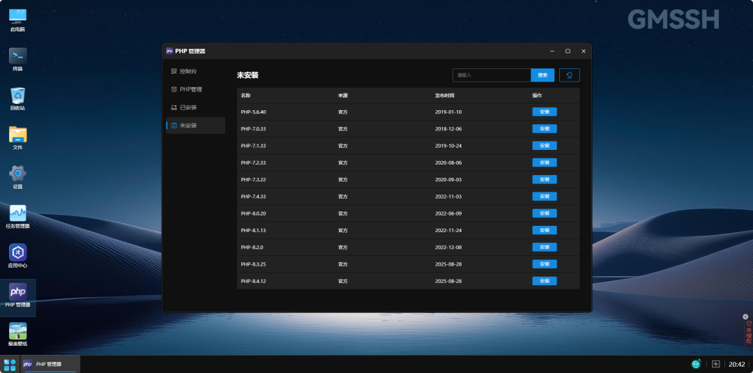 上面是在Windows上安装客户端后访问飞牛的web桌面管理界面,如果Windows上没安装GMSSH就不能使用桌面管理,这就需要将web版本私有化部署到你的NAS上面