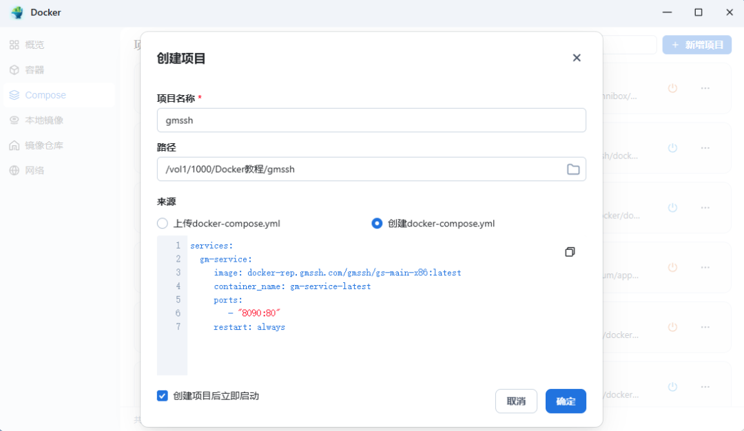 1️⃣ 桌面打开Docker,点击侧栏 Compose -> 新增项目 -> 输入项目名称 -> 设置路径选择前面第1️⃣步创建的文件夹->创建docker-compose.yml把下面代码复制进去,点击完成 直至构建完成