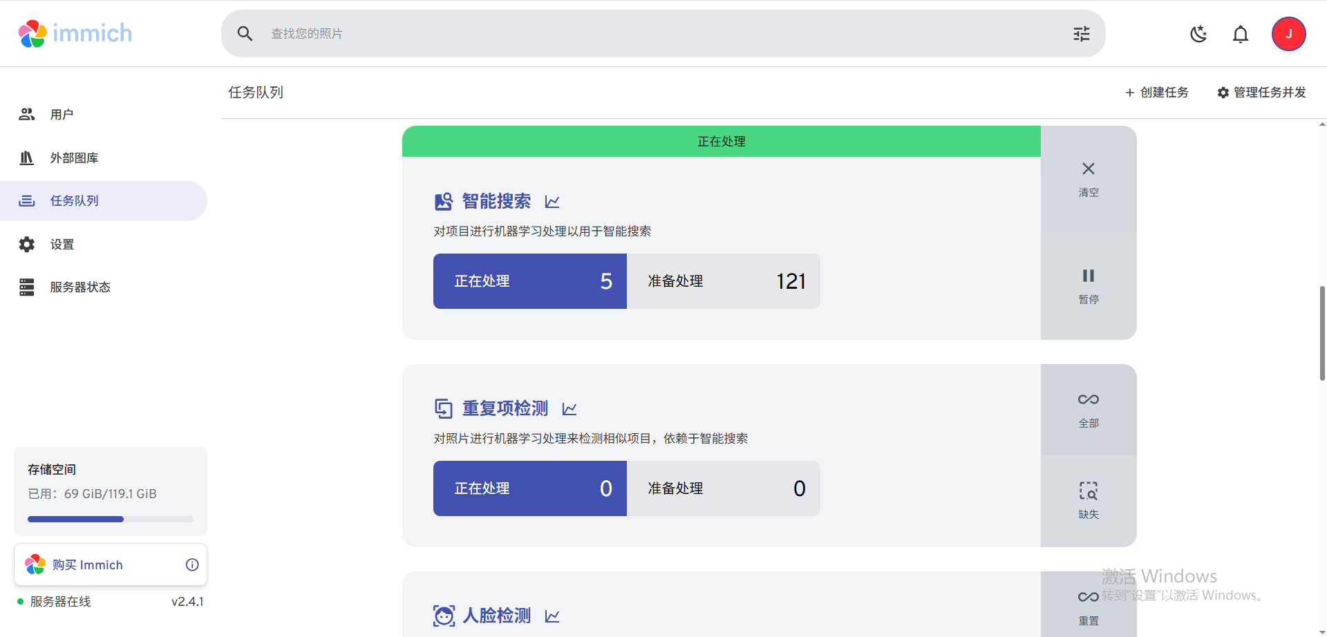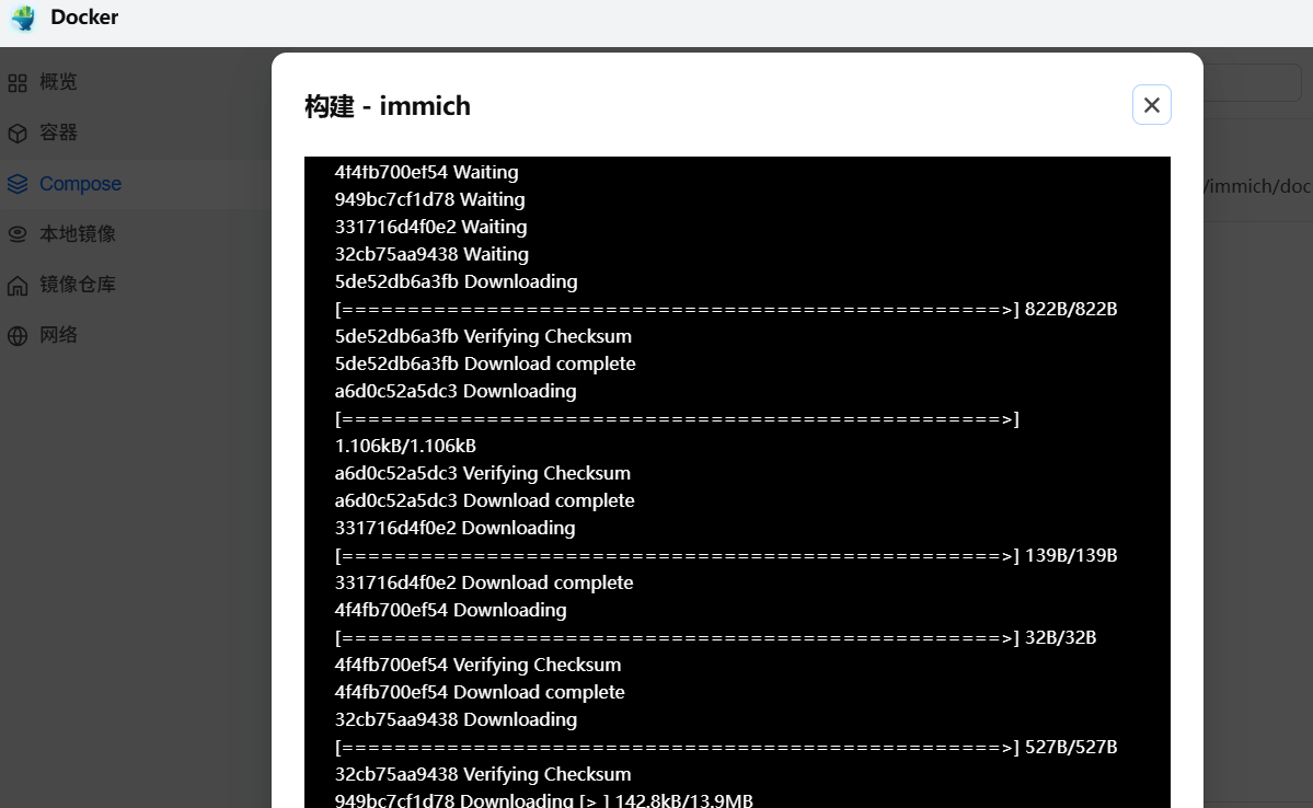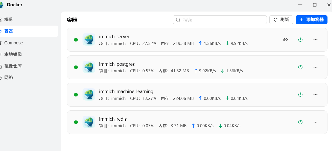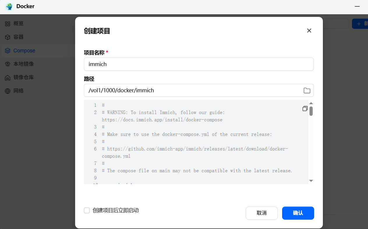 这里用immich相册试试能不能把npu用起来,在docker compose中创建immich docker compose,这里事先配置好了文件和智能搜索模型,具体可参考immich官网教程