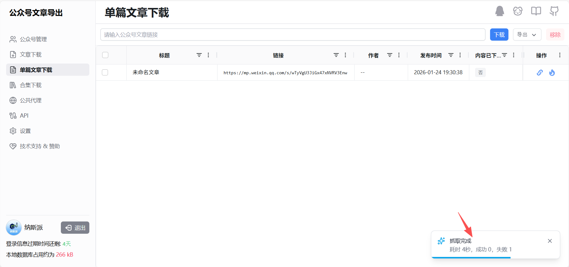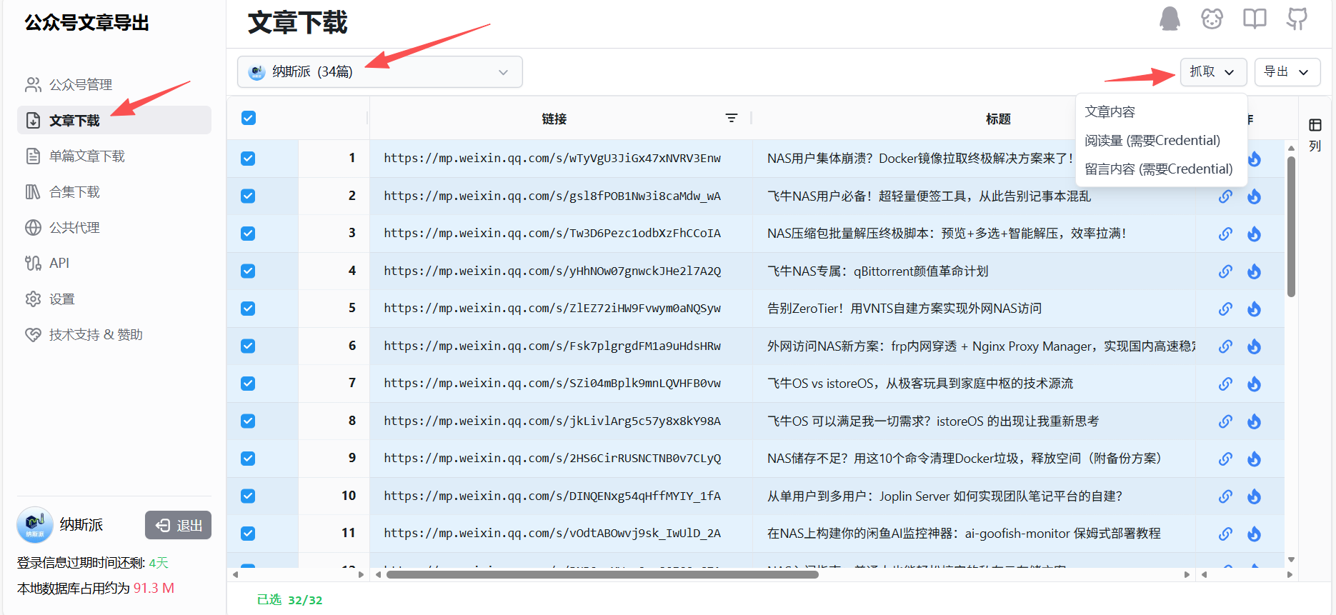 添加完账号,到文章下载,选择你要下载文章的账号,选择文章,点“抓取”,等待后台抓取完毕,就可以导出本地了。
