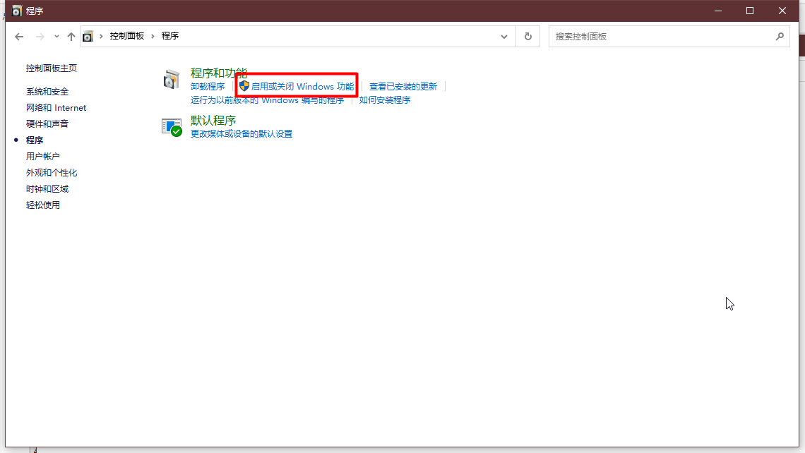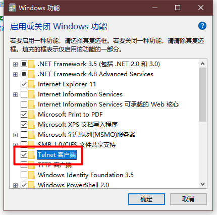 3、点击:程序 → 启用或关闭 Windows 功能 → 勾选 Telnet 客户端 → 点击确定。