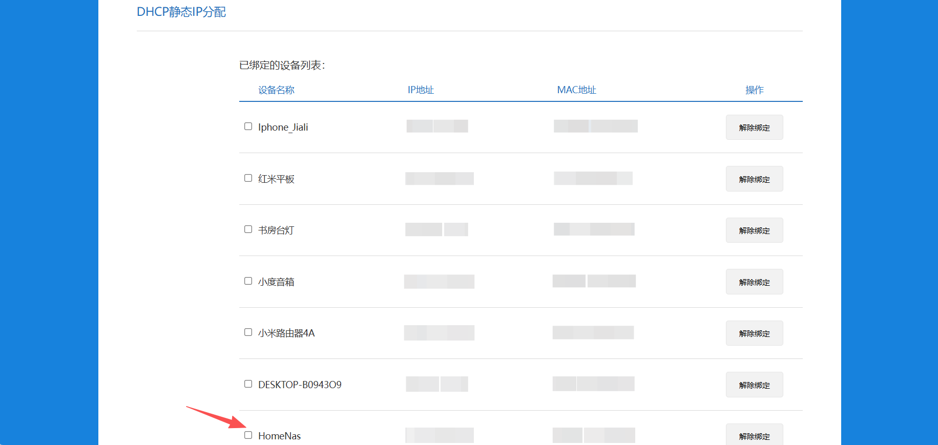 找到局域网设置 → DHCP静态IP分配 → NAS_IP地址绑定