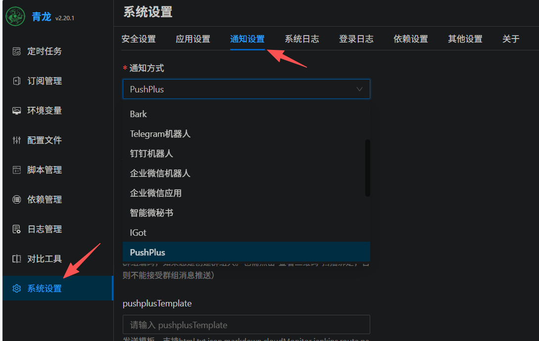 想让任务跑完后给你发个微信提醒?青龙面板支持企业微信、Server酱、钉钉等多种通知方式。这里以PushPlus应用为例: