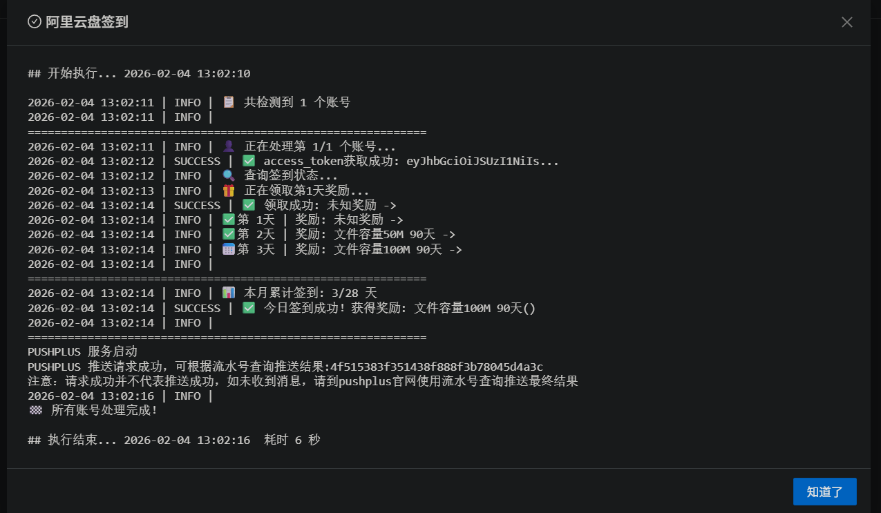 部署完成后,以阿里网盘自动"打卡"为例,演示完整配置流程。