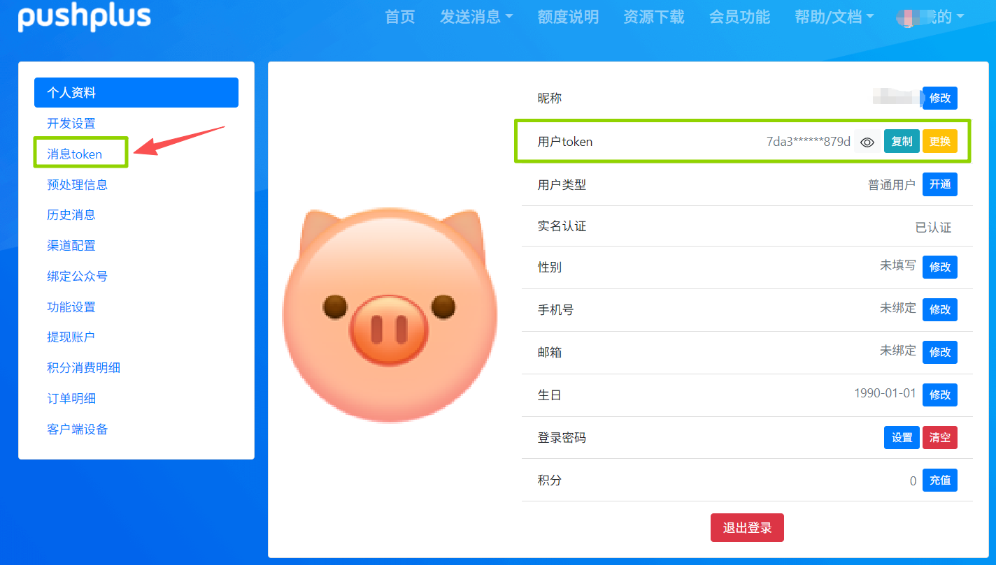 1. 访问https://www.pushplus.plus → 注册,登入后台 → 绑定微信 → 个人资料