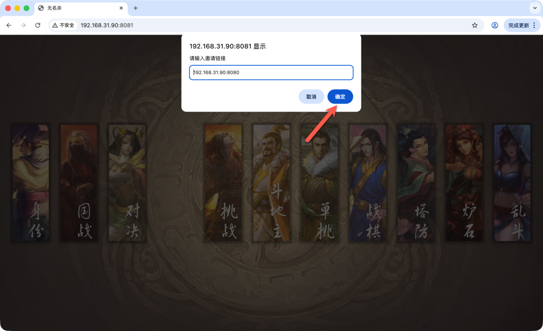 无名杀-联机-国战-1/4无名玩家邀请你加入11343892485房间联机地址:192.168.31.90:8080请先通过游戏内菜单-开始-联机中启用“读取邀请链接”选项
