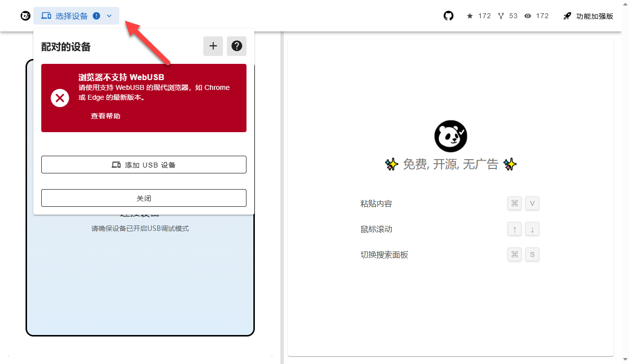 点击“设置设备”,如果不是本机部署访问,大概率会提示不支持 WebUSB 功能