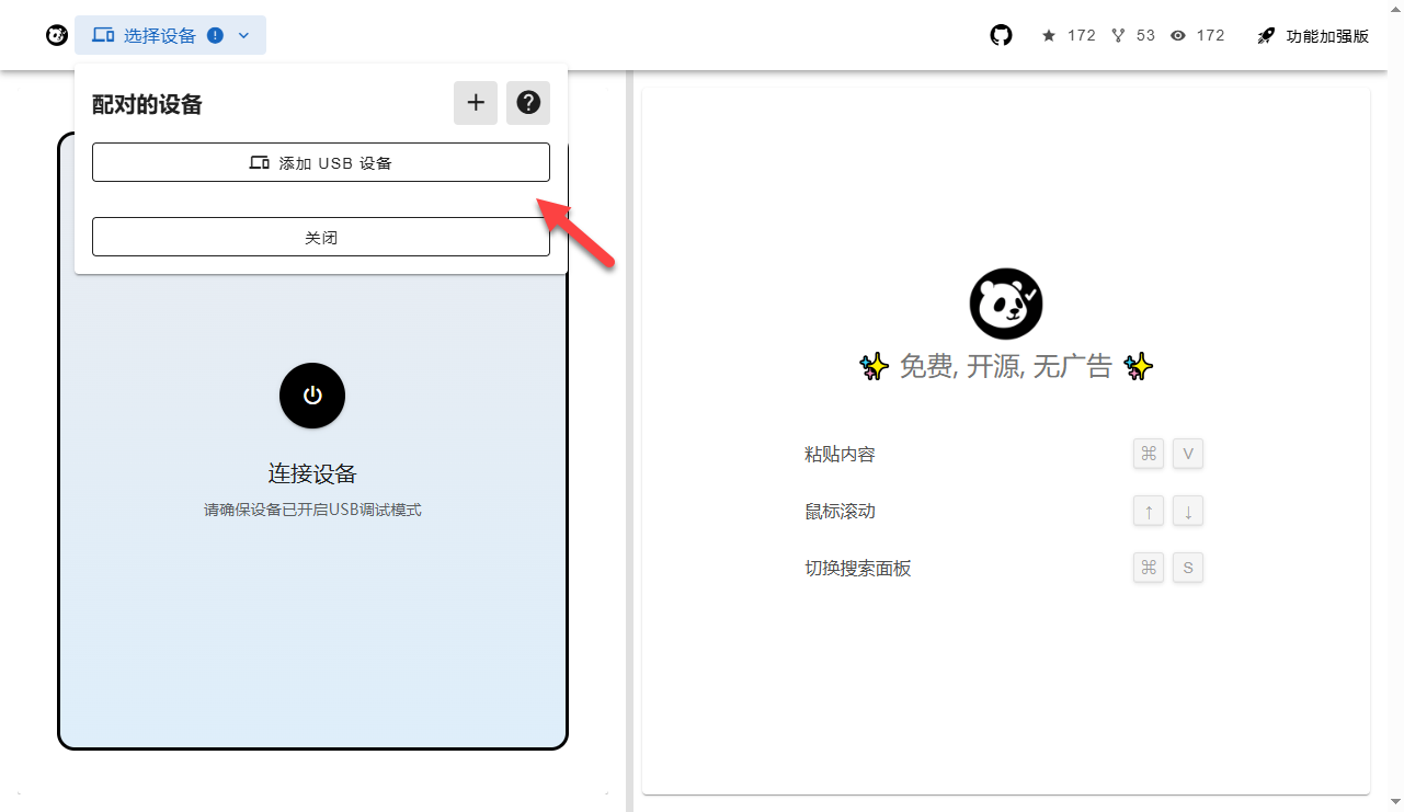 点击“添加 USB 设备”(手机打开 USB 调试功能,使用数据线连接电脑)