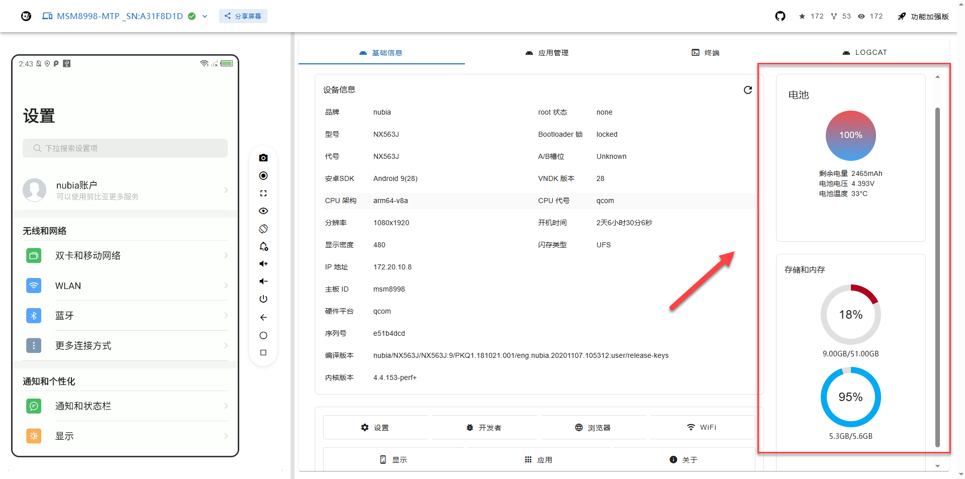 电池电量,存储和内存也都能直观看到