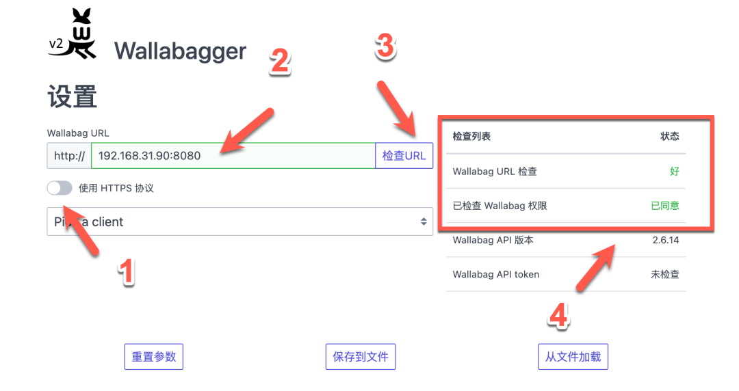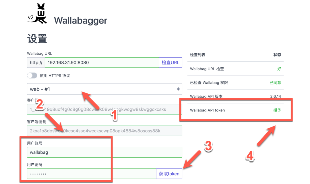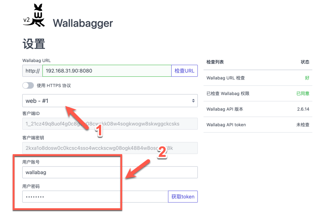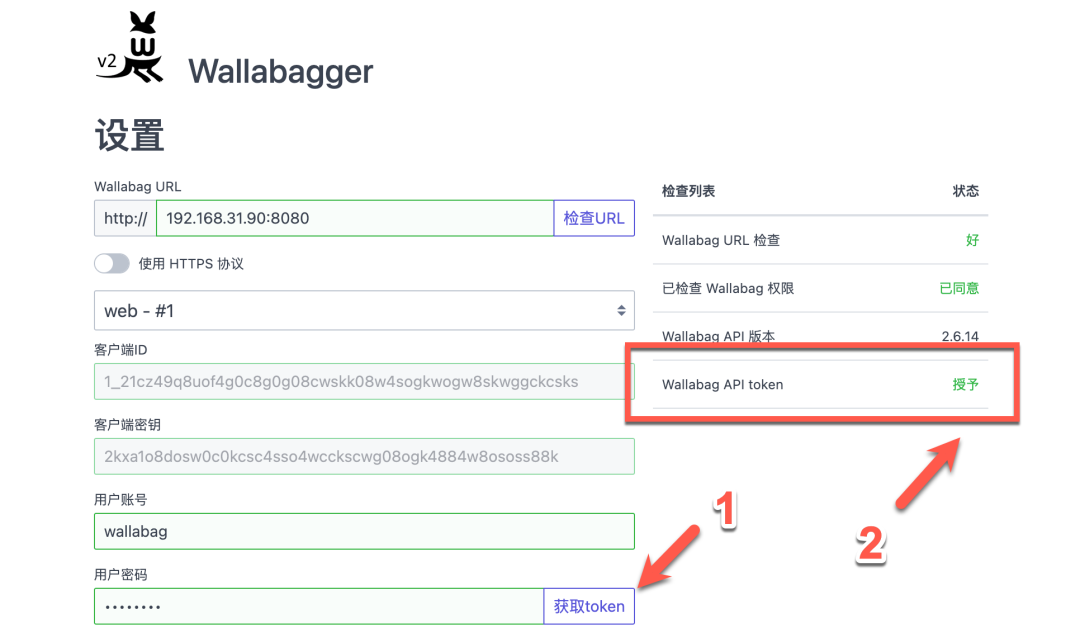 打开浏览器插件,先填 URL 地址,检测是否能连上 wallabag 服务(默认是 HTTPS 协议,需要的自行设置)
