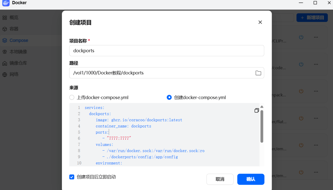 2️⃣ 桌面打开Docker,点击侧栏 Compose -> 新增项目 -> 输入项目名称 -> 设置路径选择前面第1️⃣步创建的文件夹->创建docker-compose.yml把下面代码复制进去,点击完成 直至构建完成