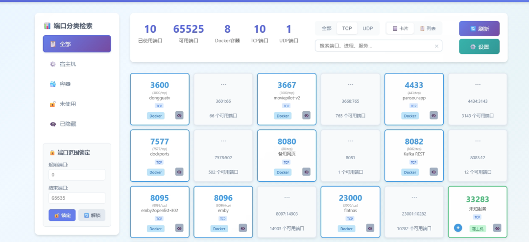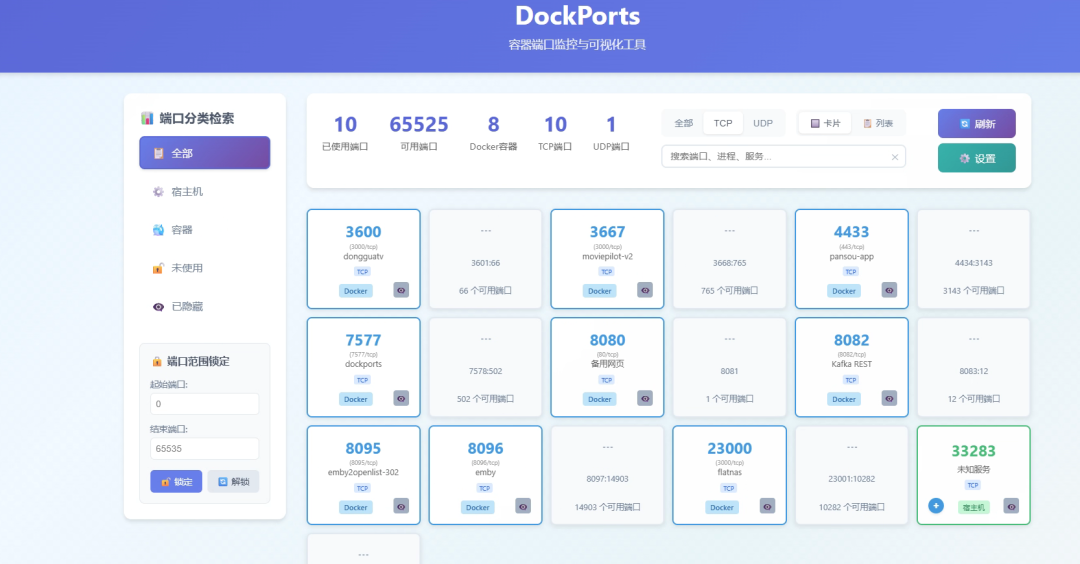 天给大家介绍一款现代化的 Docker容器端口监控与可视化工具,它把原本零散、复杂的端口信息,全部“摊平”在一个清爽直观的界面中,让你一眼就能看清当前系统的端口使用情况
