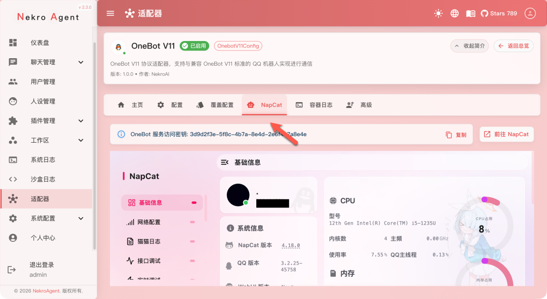 设置正确之后,就可以在下面显示 NapCat 的界面了