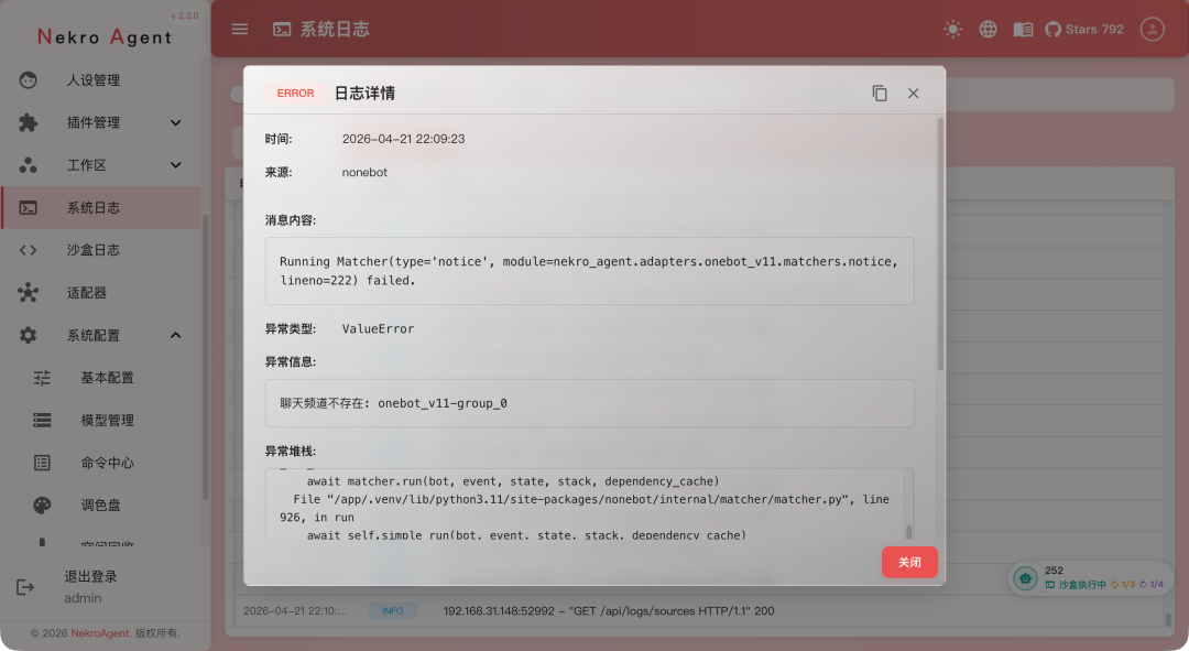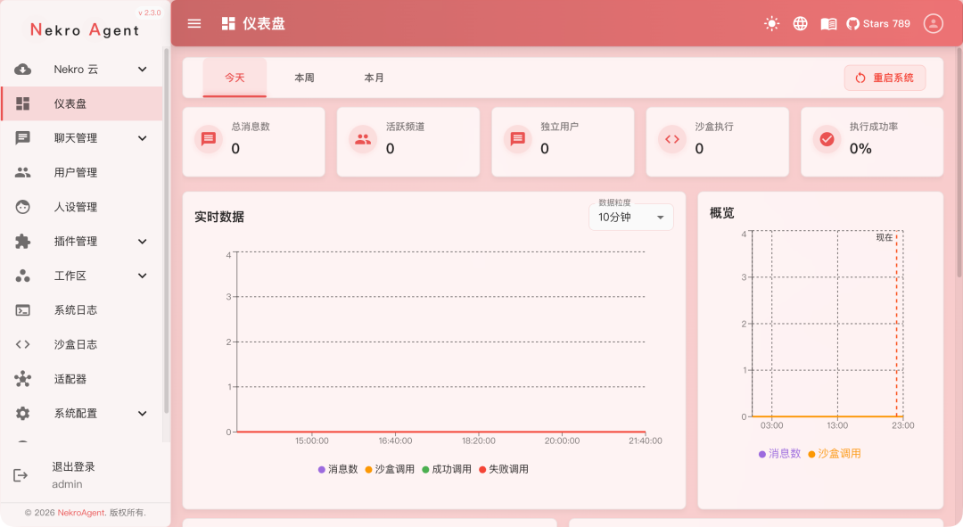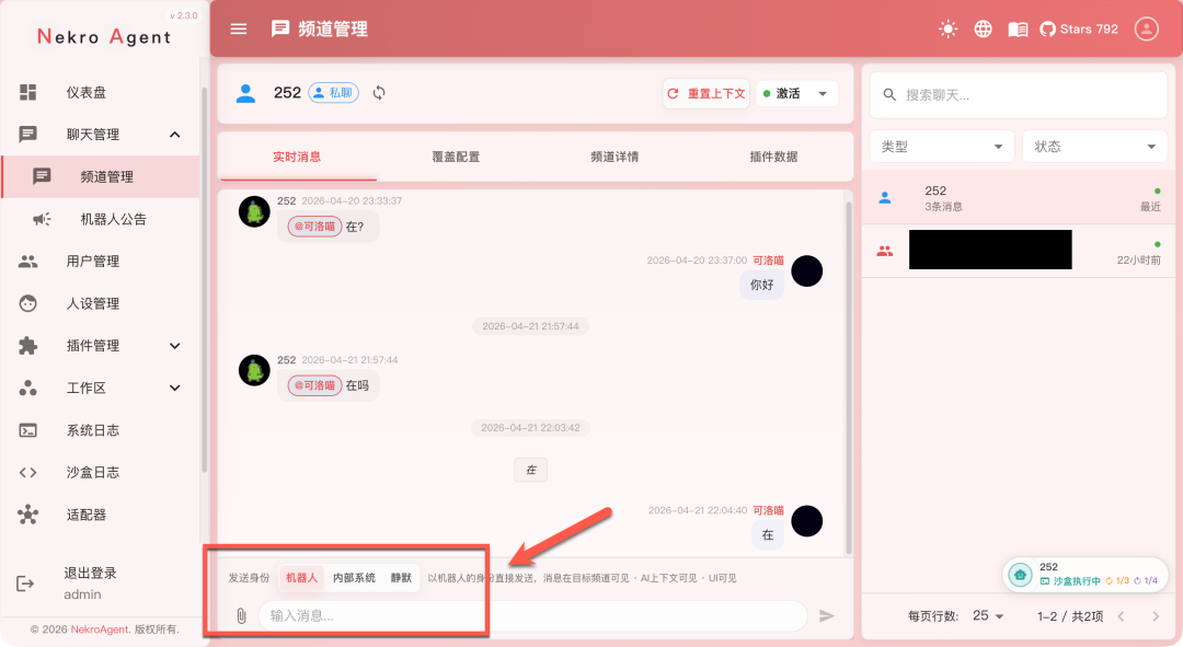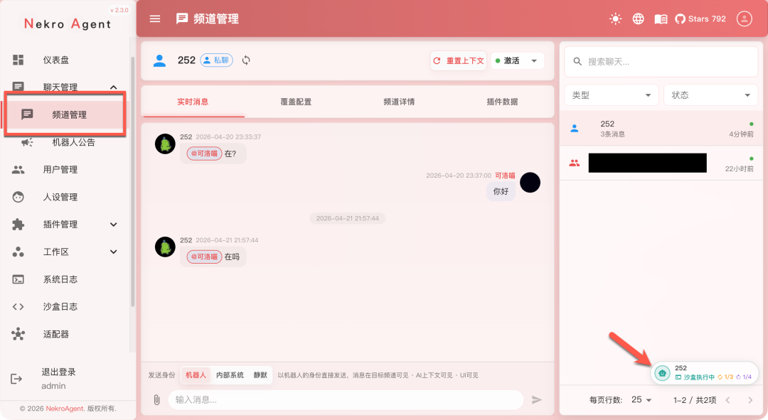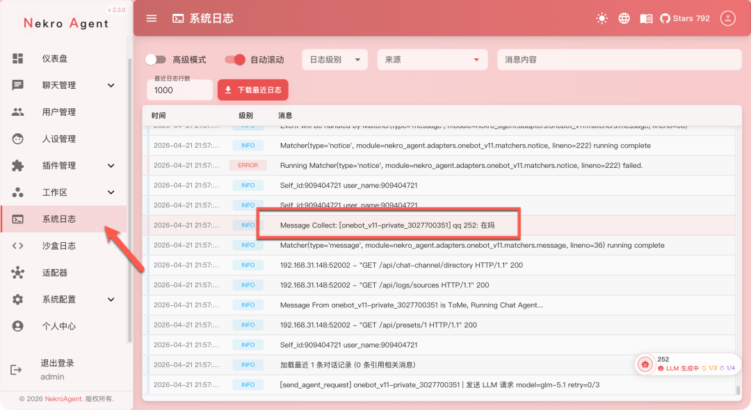 Nekro Agent 是一款很火的跨平台智能交互框架,主打互动场景,集成了代码沙盒、长期记忆和可视化面板,支持 QQ、Discord 及直播接入。不得不说扩展性是真的强,很适合做直播回复,微信和 QQ 聊天机器人。不过上手还是有一定难度的,虽然网上有很多人介绍安利,但实际上手的教程很少,我自己折腾几天还是有问题。有兴趣的用户可以试试,说实话还是很不错的。
