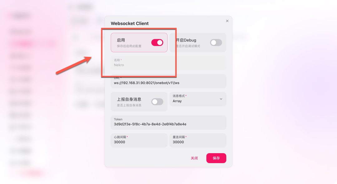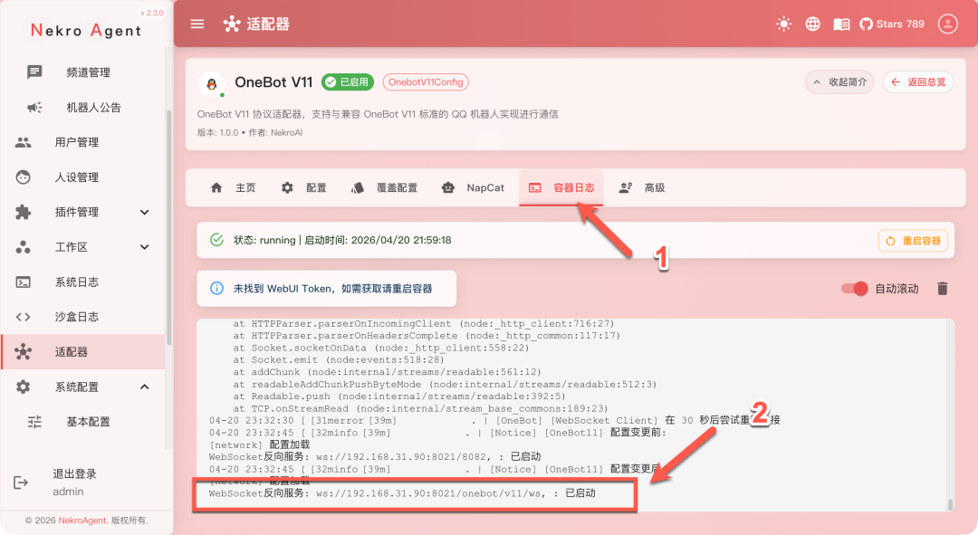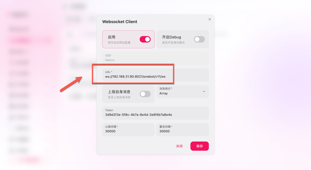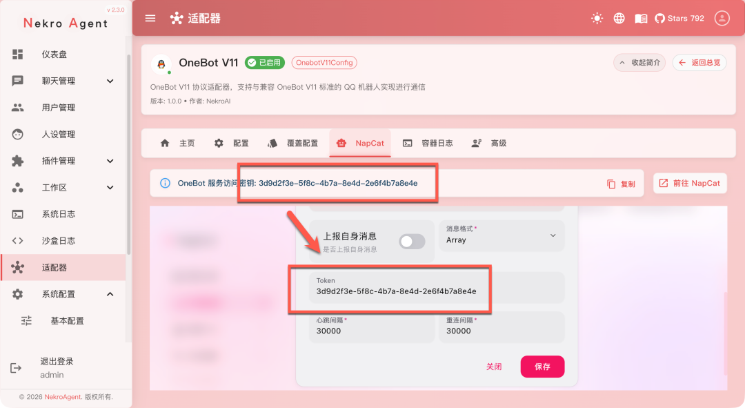 Token 填写刚才在 Nekro Agent 页面里看到的 OneBot 服务访问密钥