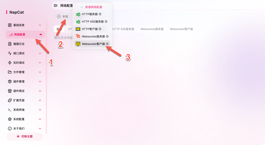 下面需要去到 NapCat 里新建一个 Websocket 客户端(也能在上面窗口直接配置)