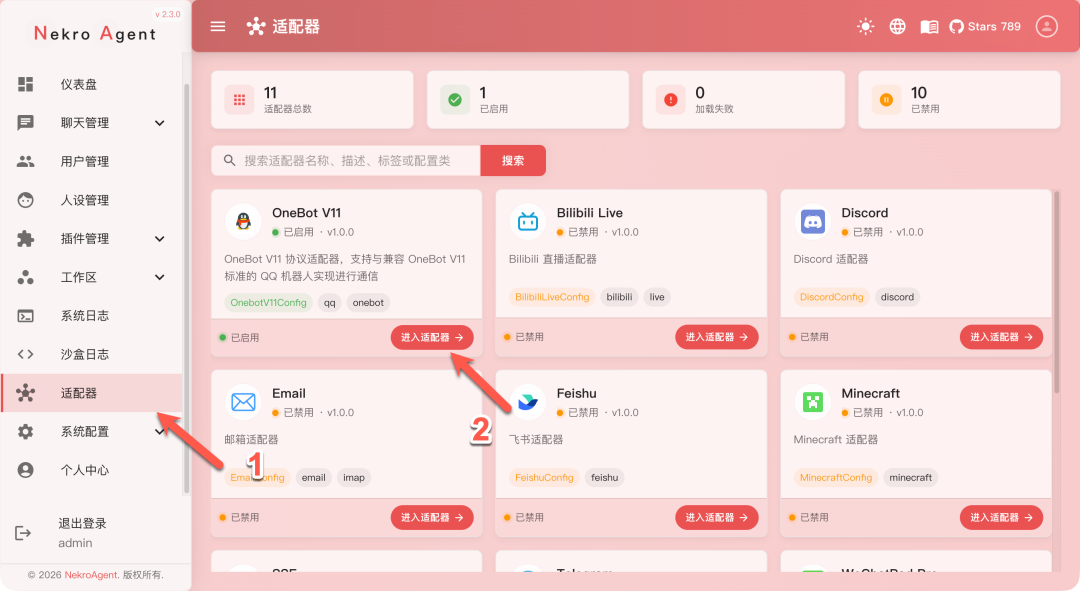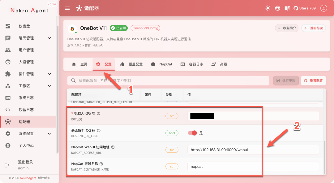 接下来设置适配器,我对接的是 QQ 机器人(需要额外部署 NapCat 容器进行联动)