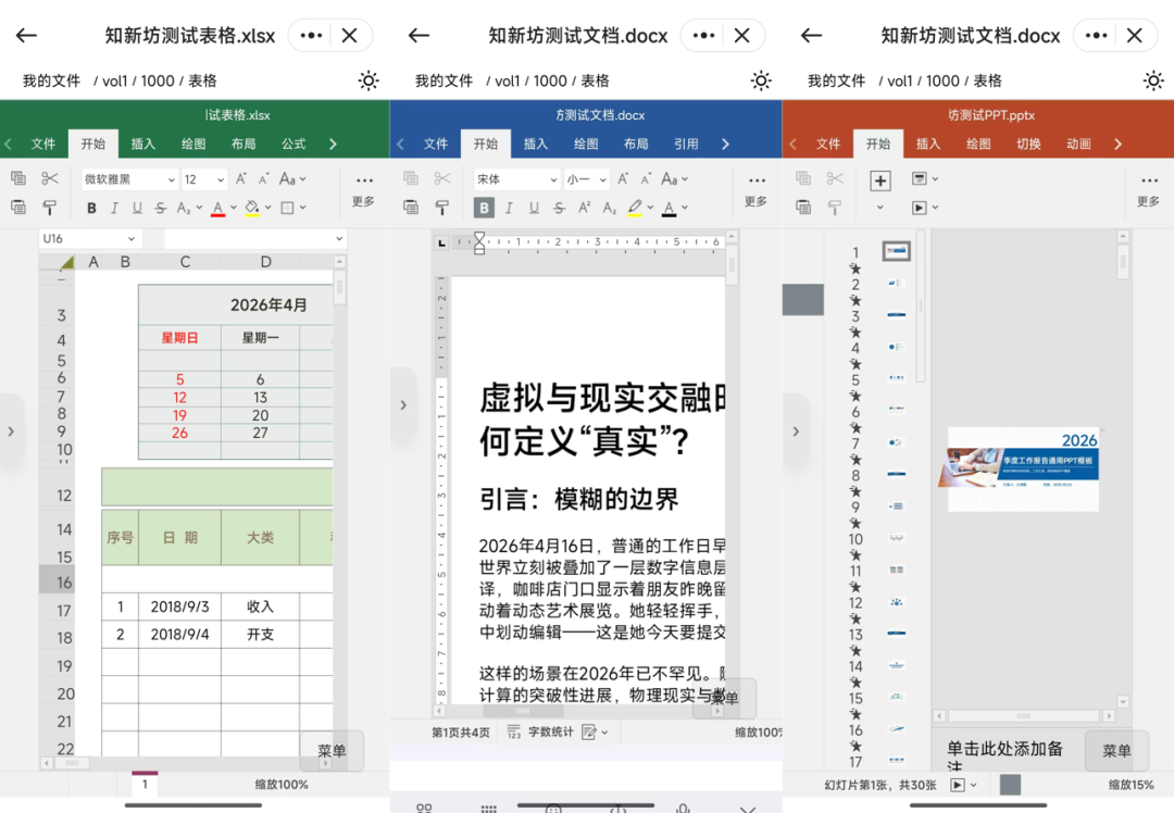再来看看移动端, Word、Excel、PPT 三种文档都能流畅打开与编辑,但是文档表格这种在手机都是很难受的