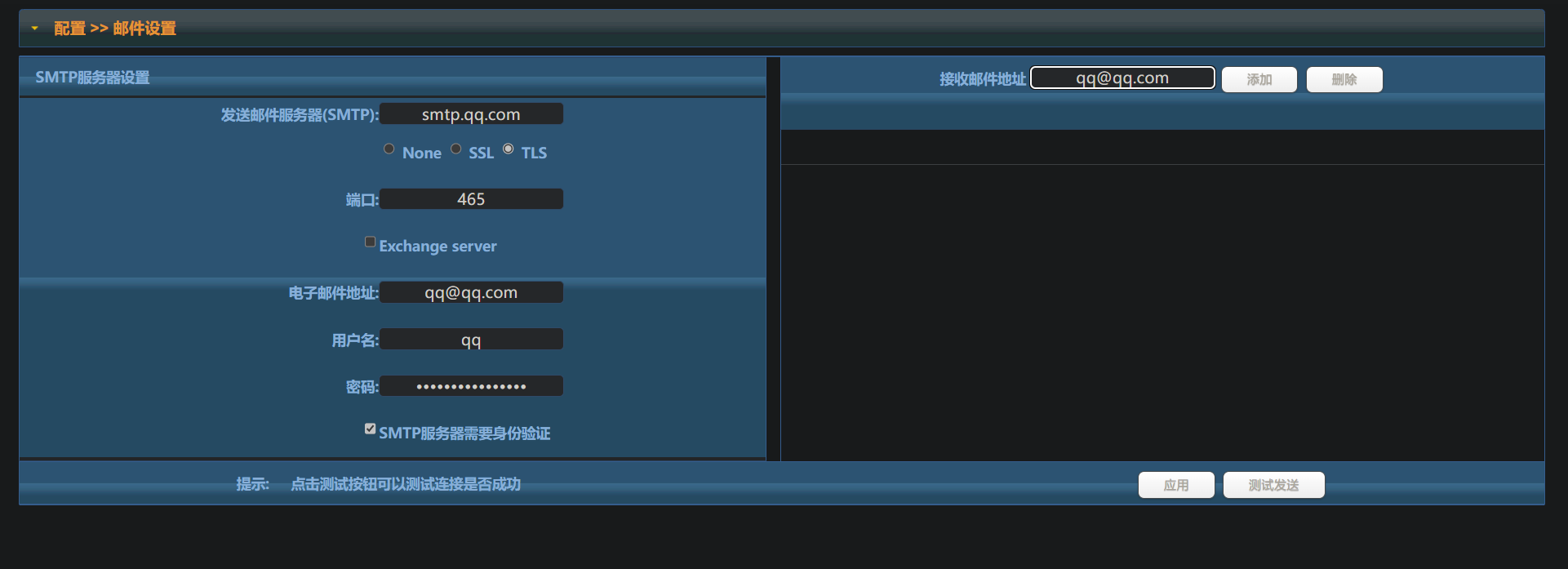 以上是 QQ 邮箱的一个示例。添加接收邮件地址后,点击添加测试发送测试配置,点击应用完成设定