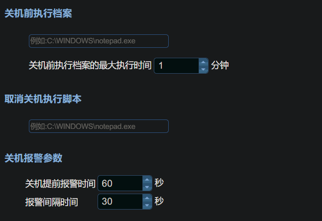 以上三个条件只允许选择一个。其中条件②的中文实在是晦涩难懂,我将页面语言切换为英文后顿时豁然开朗(The local system is still on but execute file after X Min X Sec.)——条件②是与下面关机前执行的文件选项相关的,要共同设置。