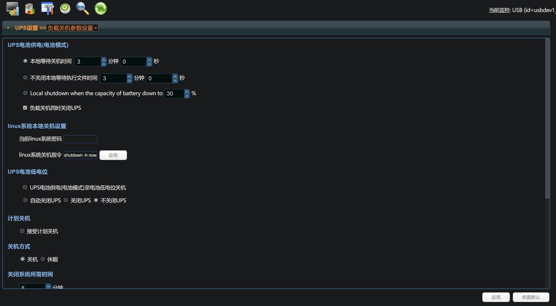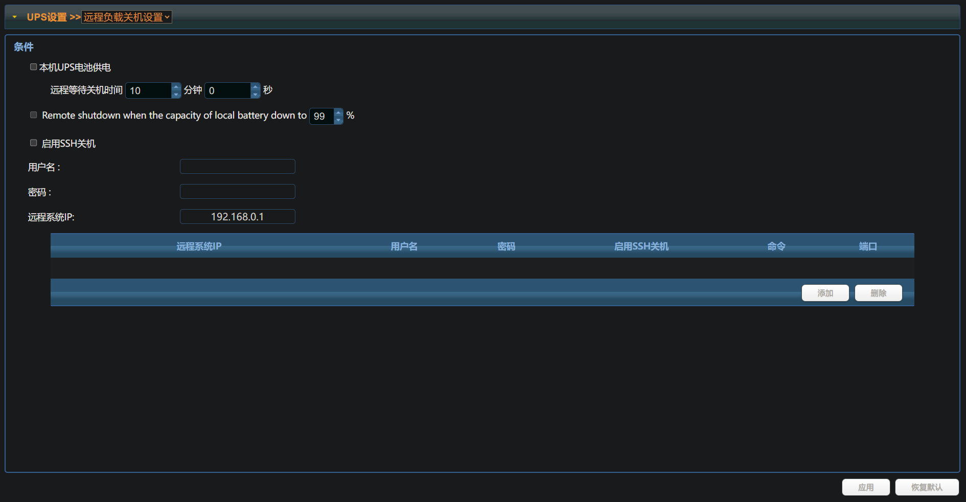 勾选 本机UPS电池供电 并设定远程关机等待时间,设定关机条件。