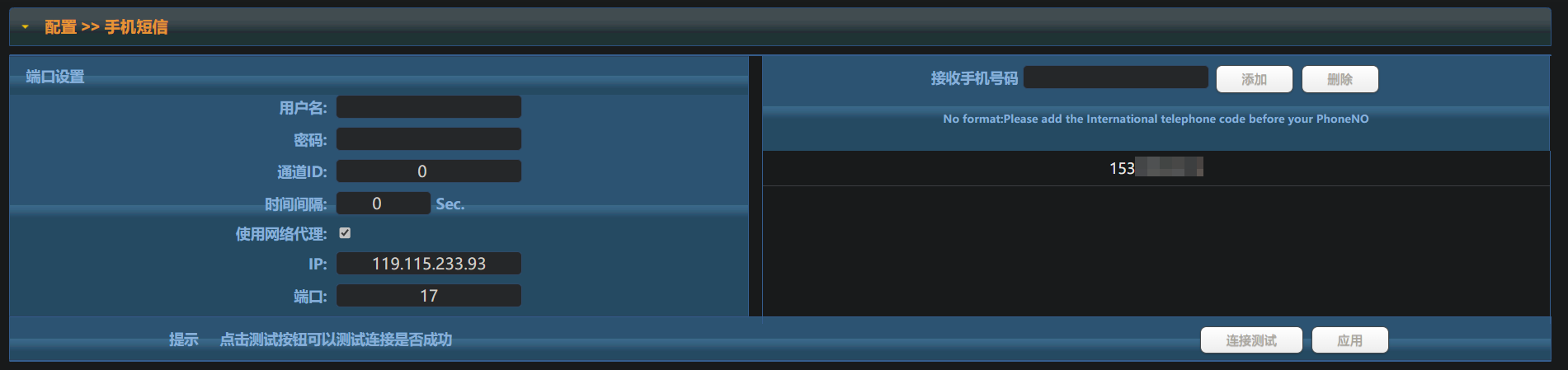 此处仅需要添加接受手机号码,点击连接测试后,短信将自动通过雷迪司租用的短信端口进行下发: