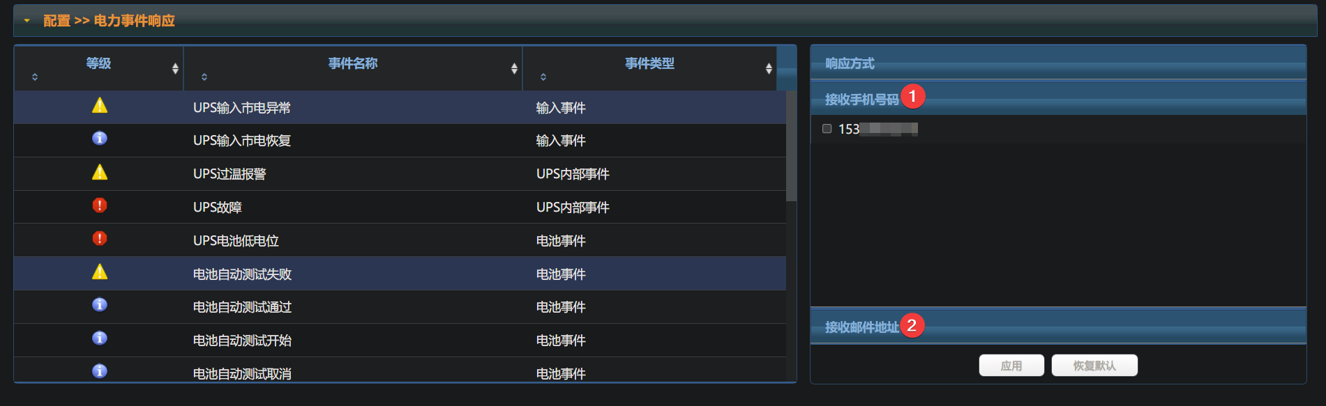 对系统左侧列出的感兴趣的事件,点击依次点击右侧的接收手机号码和接收邮件地址,并勾选已设定的接收人。每个事件更新完后,均需要点击右下角应用按钮确认。