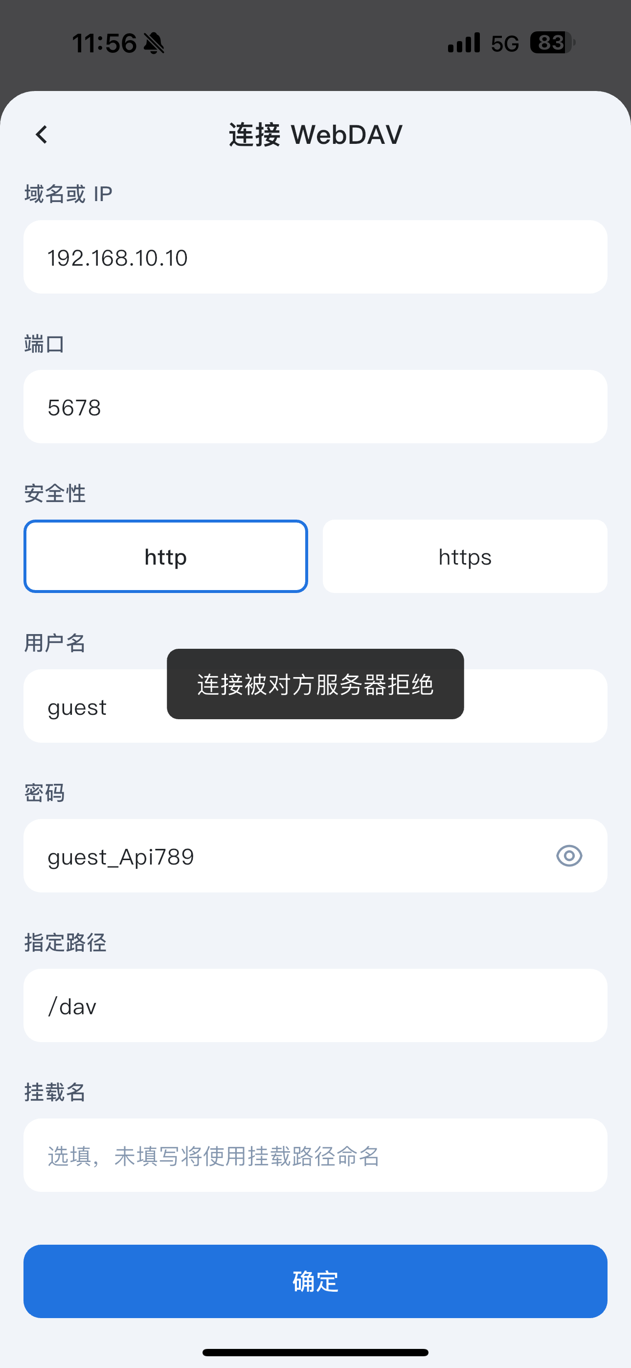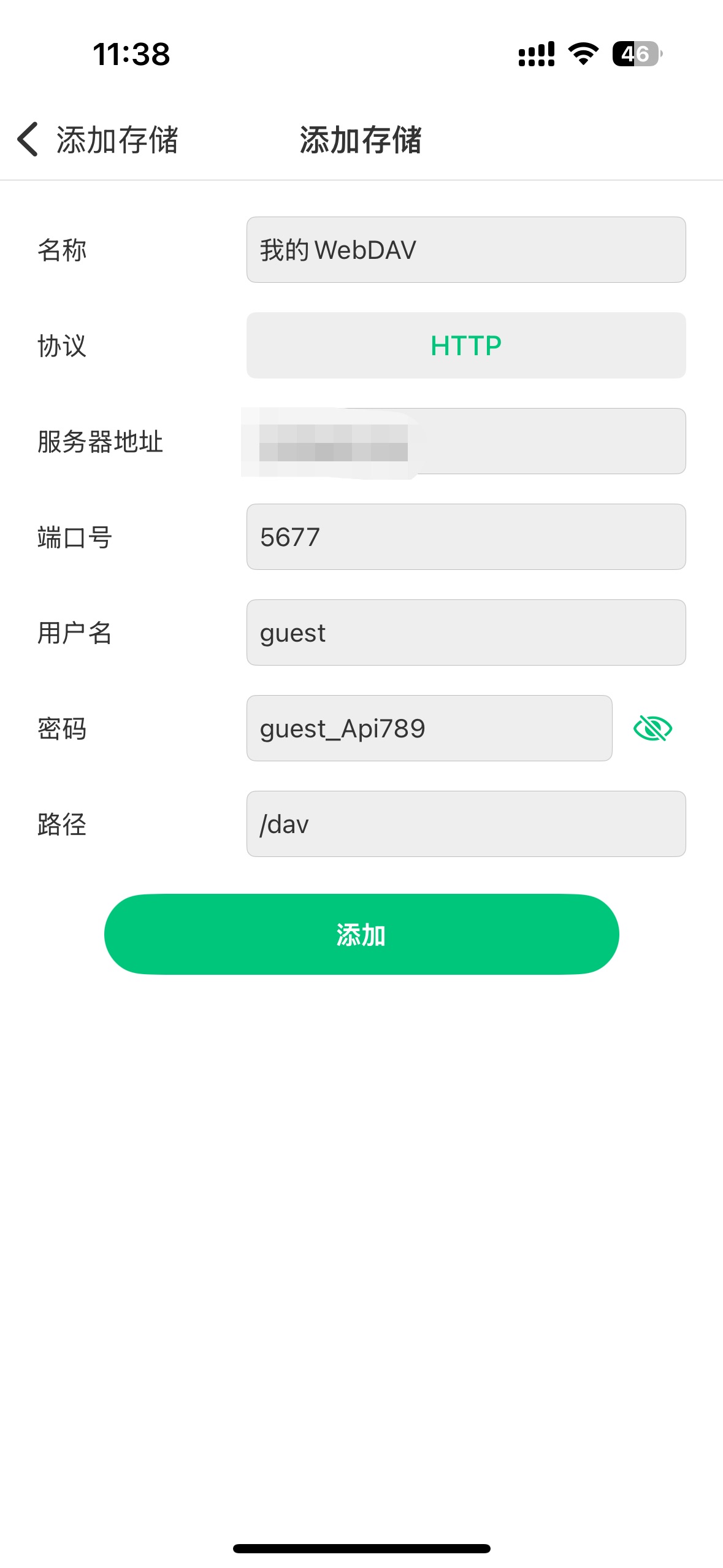 5.使用飞牛的局域网IP+配置文件里面设置的第一个端口号,比如我的是http://192.168.2.146:5677 , webdav的配置的用户名和密码是guest/guest_Api789。