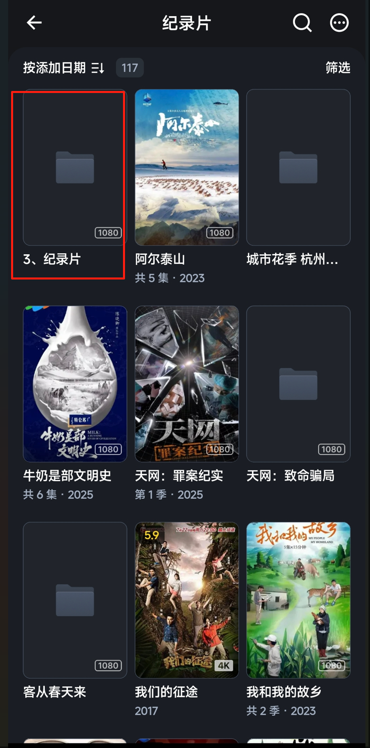 看上去是把这两个文件当成一个纪录片了,然后用根目录“3、纪录片”作为纪录片的“名字”了,又或者是干脆把这两个文件当做“其他视频”,然后默认按照文件夹方式展示了