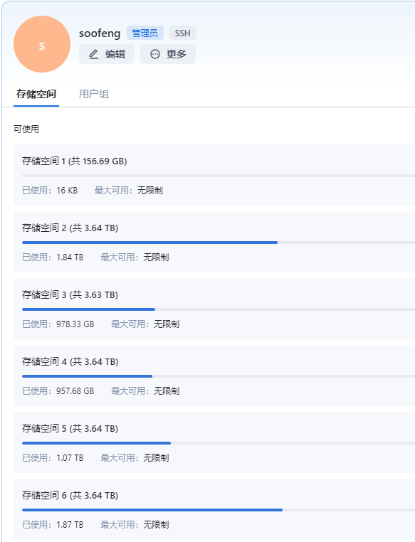 没有其它用户啊,就一个管理员用户,我这个存储空间6里的1.87T资料是从存储空间4里剪切出来的,然后存储空间4现在可用空间还没有1.87T