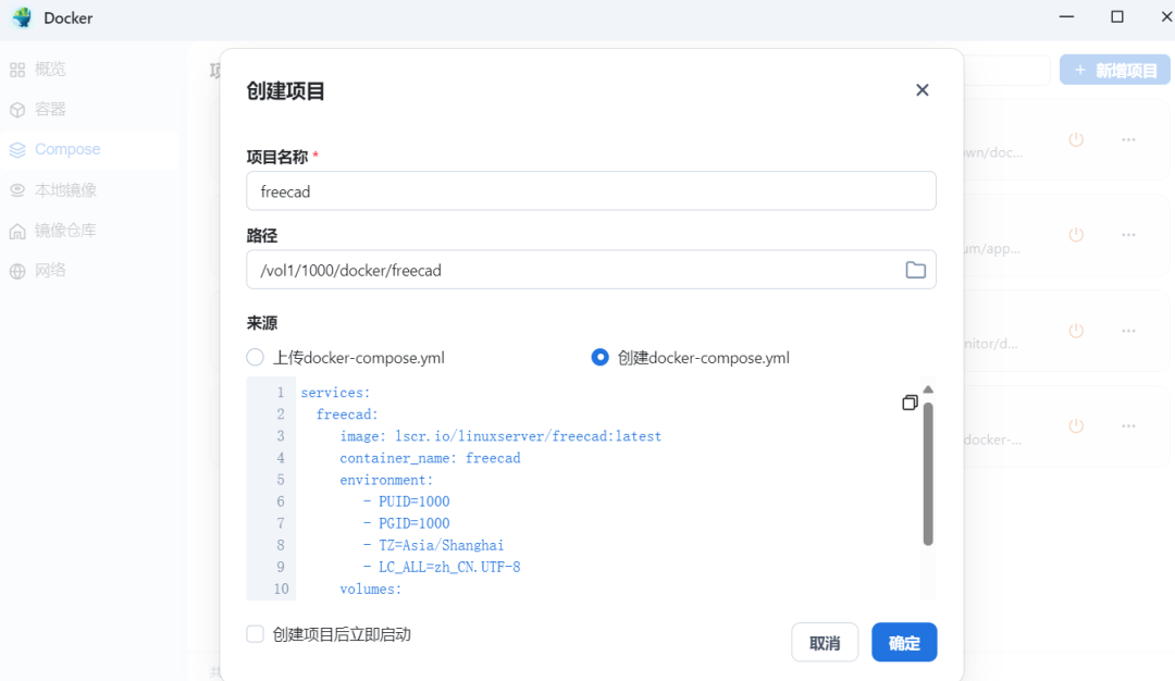2️⃣ 桌面打开Docker,点击侧栏 Compose -> 新增项目 -> 输入项目名称 -> 设置路径选择前面第1️⃣步创建的文件夹->创建docker-compose.yml把下面代码复制进去,点击完成 直至构建完成