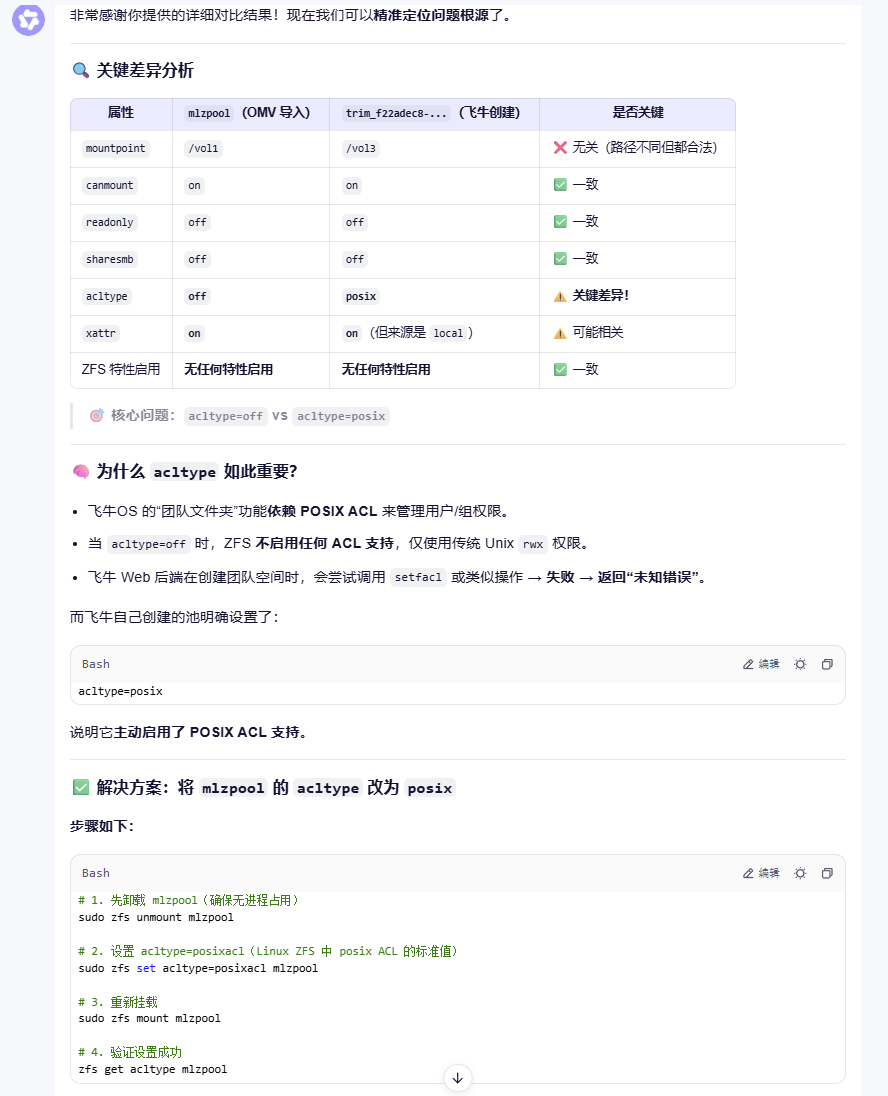 导入OMV创建的ZFS池后,飞牛无法读写里面的文件,也不能创建新文件夹