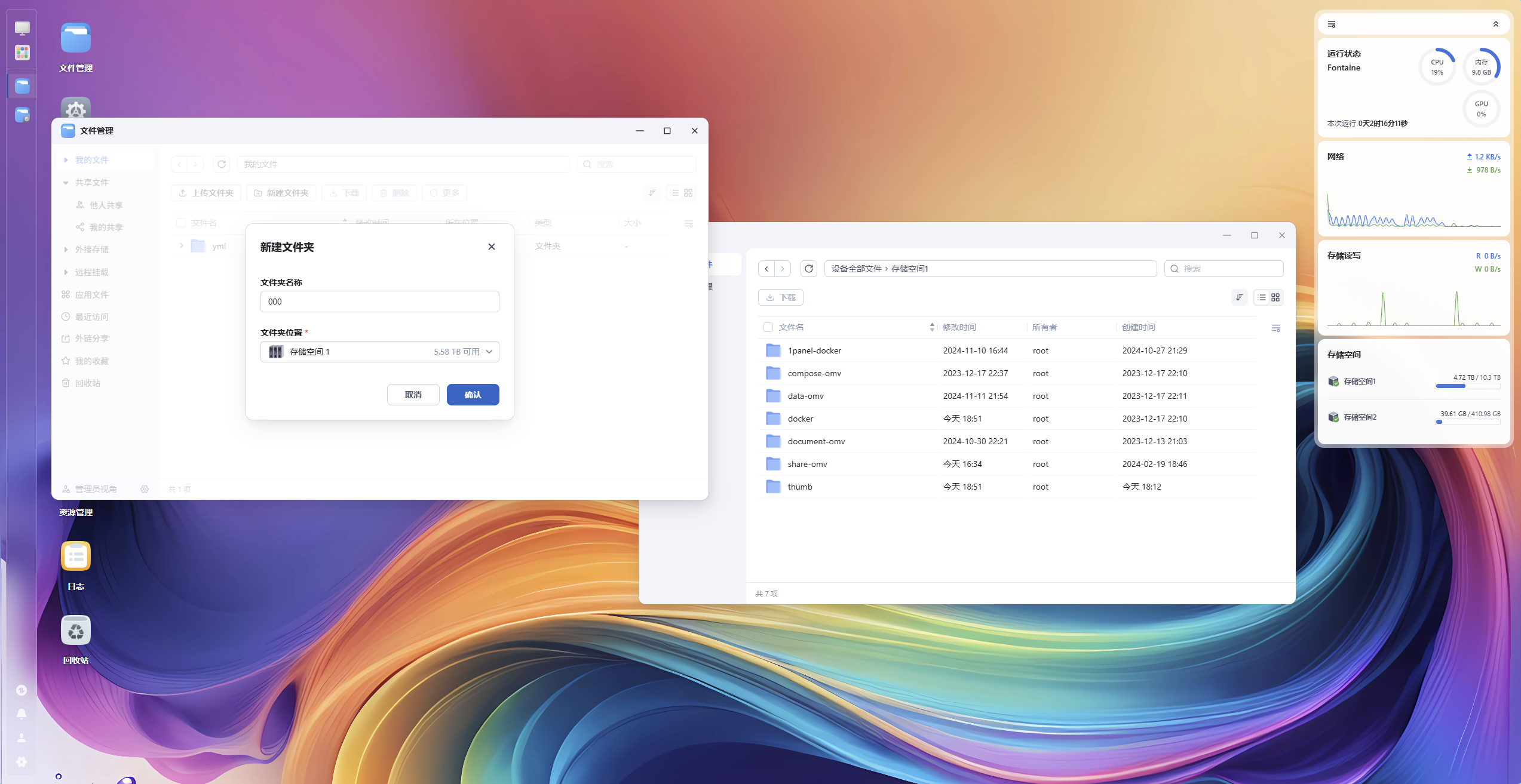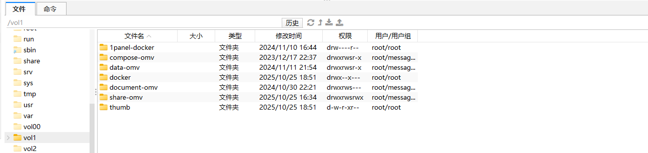 但是在文件管理界面无法使用该存储空间创建新文件夹。编写docker compose文件时如果使用了里面的路径(根目录下/vol1)就会报错,无法正常使用。