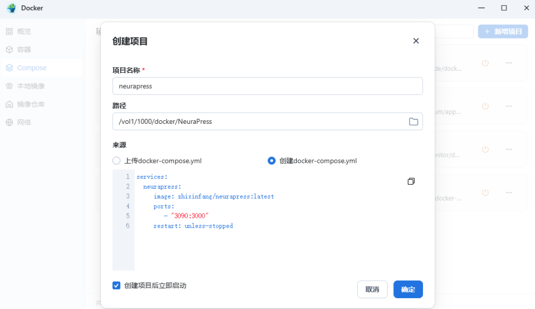 2️⃣ 桌面打开Docker,点击侧栏 Compose -> 新增项目 -> 输入项目名称 -> 设置路径选择前面第1️⃣步创建的文件夹->创建docker-compose.yml把下面代码复制进去,点击完成 直至构建完成