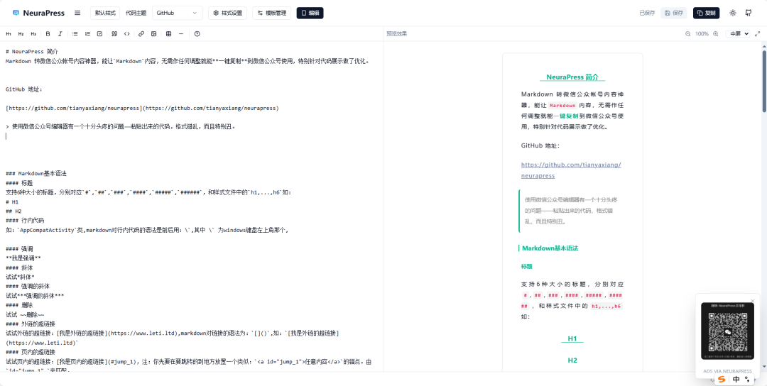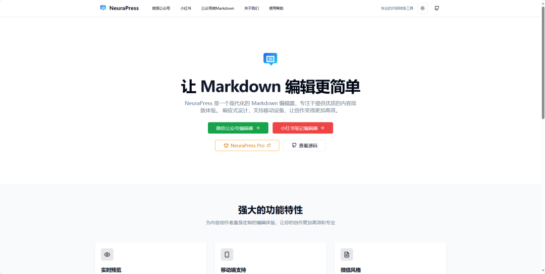 NeuraPress 是一个 专为公众号写作者设计的 Markdown 编辑器。 支持所见即所得、实时预览、一键复制 HTML,完美贴合微信编辑器样式,项目也已经上架飞牛应用中心,并且删除了无用的链接,大家根据需求使用,建议https下使用