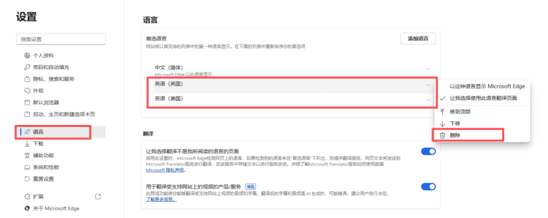 打开 Edge 设置 → 语言 → 语言首选项 ,删除除中文之外的其他语言,清理浏览器缓存,重新打开浏览器即可恢复正常。