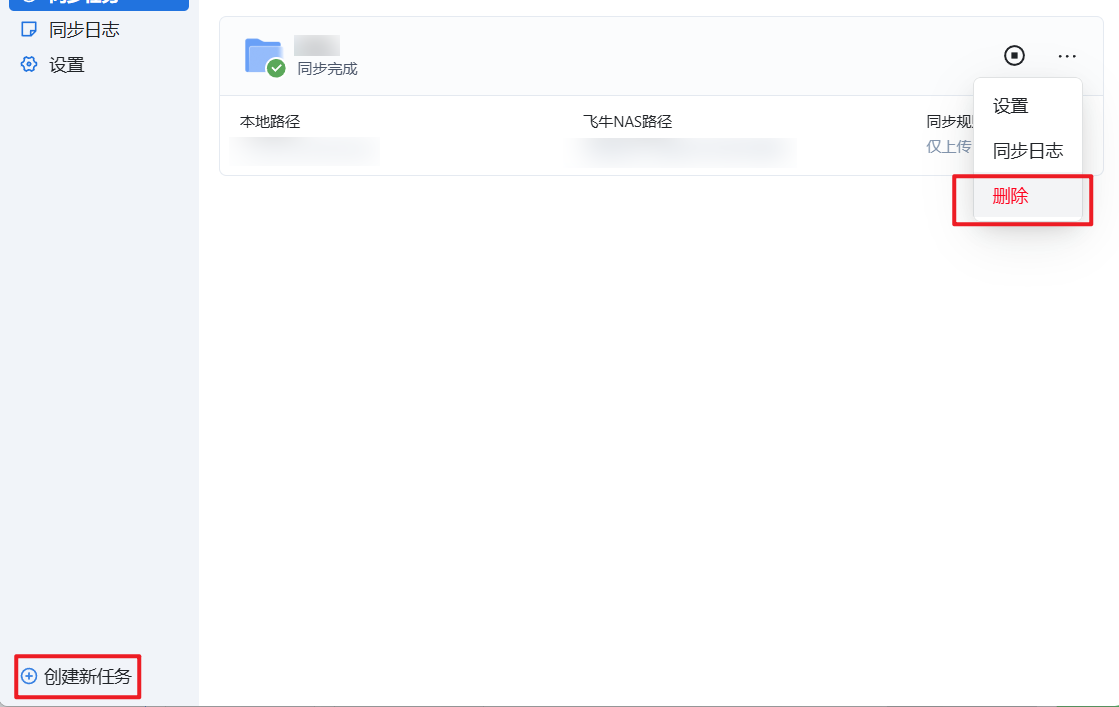 A:这个是一台NAS只能连一个账号,不能连多个账号。如果重装了系统飞牛同步任务中提示账号异常,更新连接状态提示“请输入此NAS的连接方式”,需要删除任务重新创建新任务恢复同步。